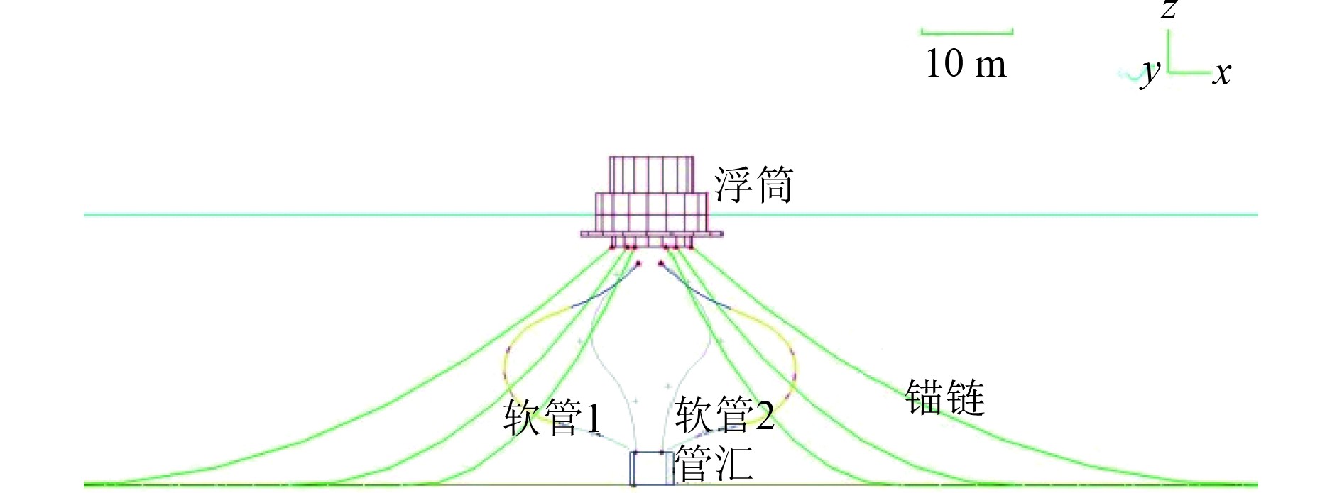3 计算模型与工况 3.1 计算模型根据给定的结构参数和环境参数,使用Orcaflex软件建立浮筒、软管及锚泊系统的模型(见图3),坐标系中X、Y为水平方向,Z为竖直方向。根据现场水深和环境情况,锚链线长度为385 m,锚泊半径为380 m,软管长度为38 m,如图4所示。