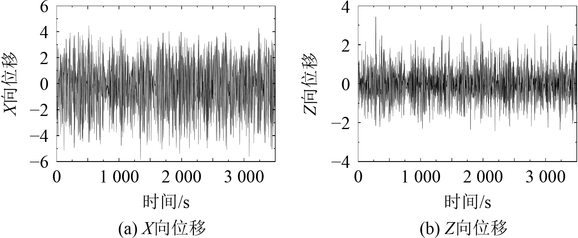 浮筒为对称结构且风、浪、流方向沿X轴负向,因此浮筒在Y向运动极小,只选取X、Z向进行分析。对于锚链张力结果如图6所示。选取受力最大的3根锚链结果分析。相关计算结果如表4~表5所示。