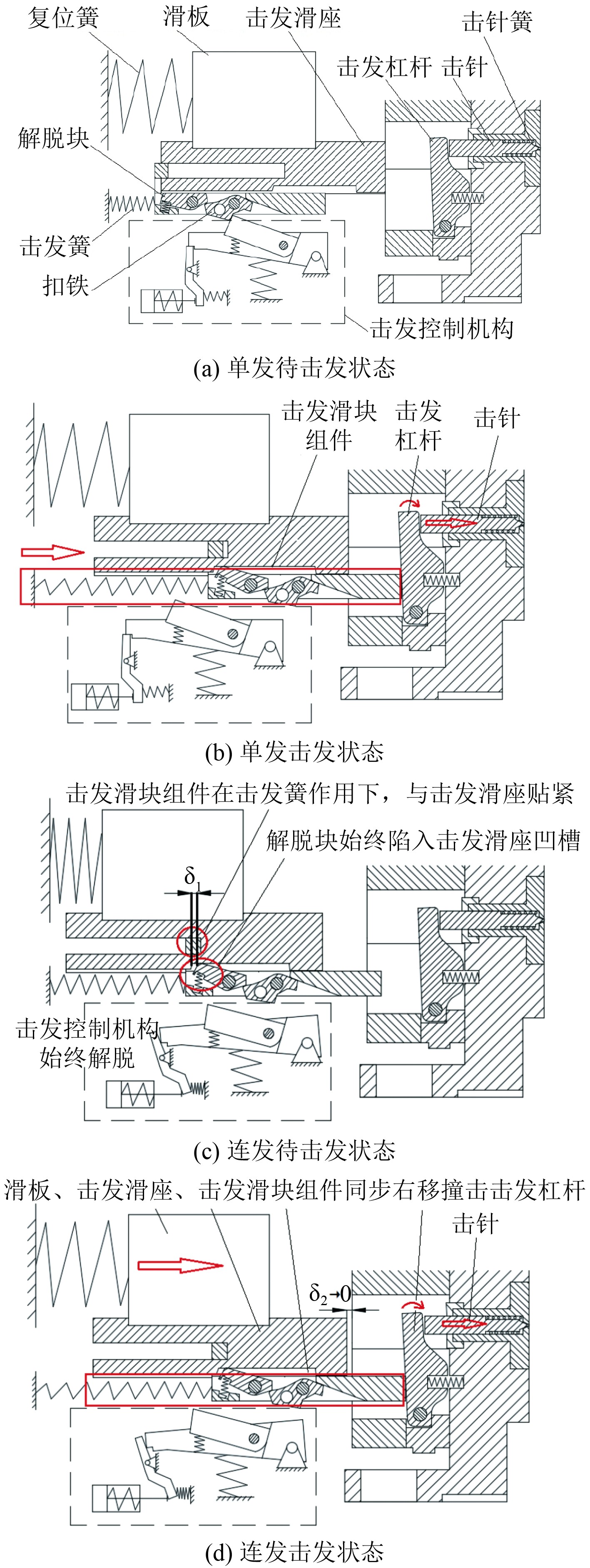 1 击发机构工作原理某自动机主要由击发滑座、击发滑块组件、击发杠杆、击发簧、击针及击发控制机构等部分组成。其中,由击发滑块、扣铁、解脱块组成的击发滑块组件安装于击发滑座内,击发滑座安装于炮箱,由击发控制机构控制击发时机。击发时,击发滑块组件解脱并撞击击发杠杆,击发杠杆继而撞击击针,实现弹药击发。击发机构单发、连发模式的工作原理如图1所示。