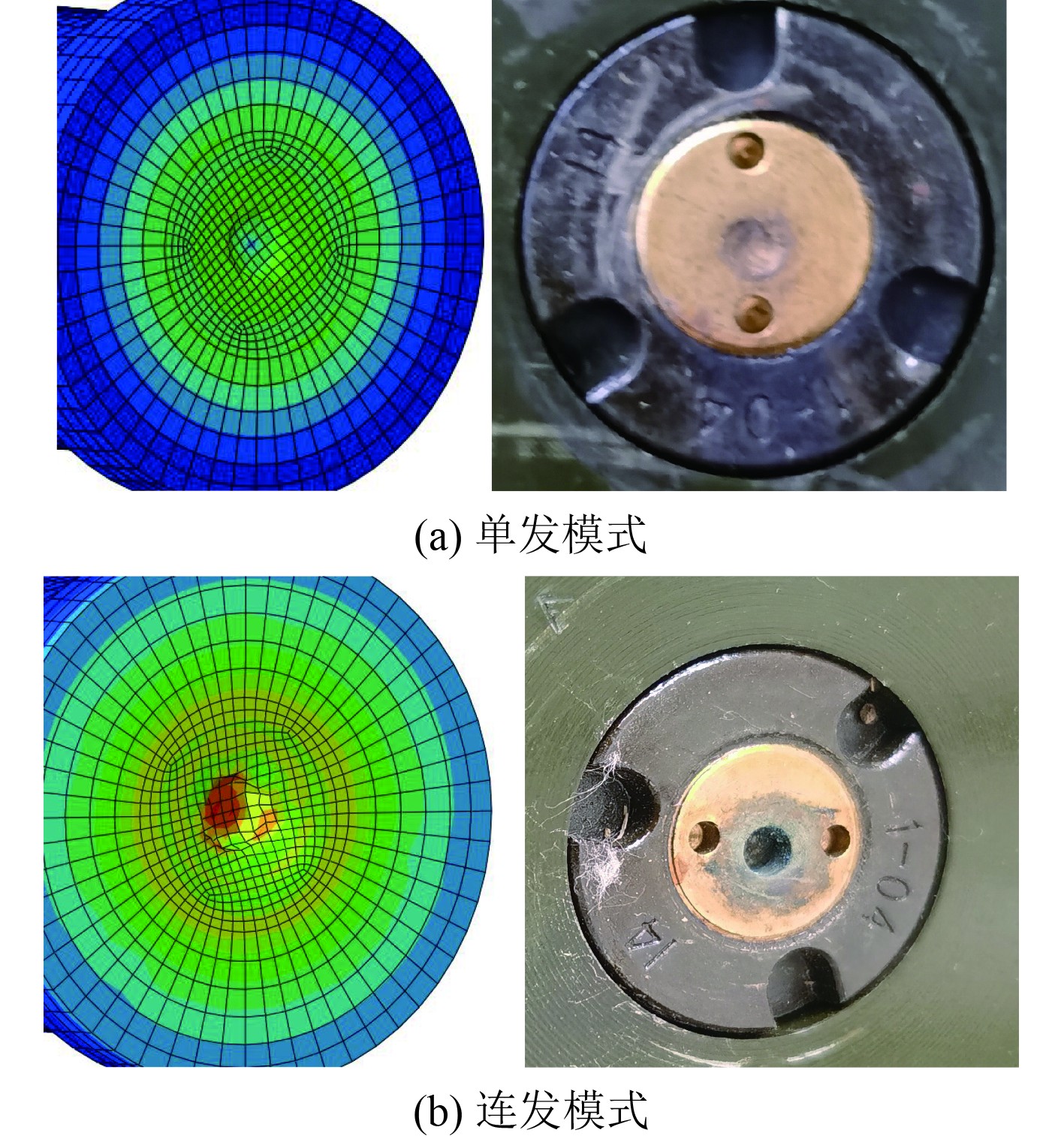 参考击发机构工况,仿真模型限制炮箱、底火、击针帽、限位套及击发杠杆轴的所有自由度,约束击发滑块组件除击针轴向外的其余自由度。以表1中的参数为输入,分别开展不同射击模式下击发过程的仿真计算,提取底火变形图,如图3所示。