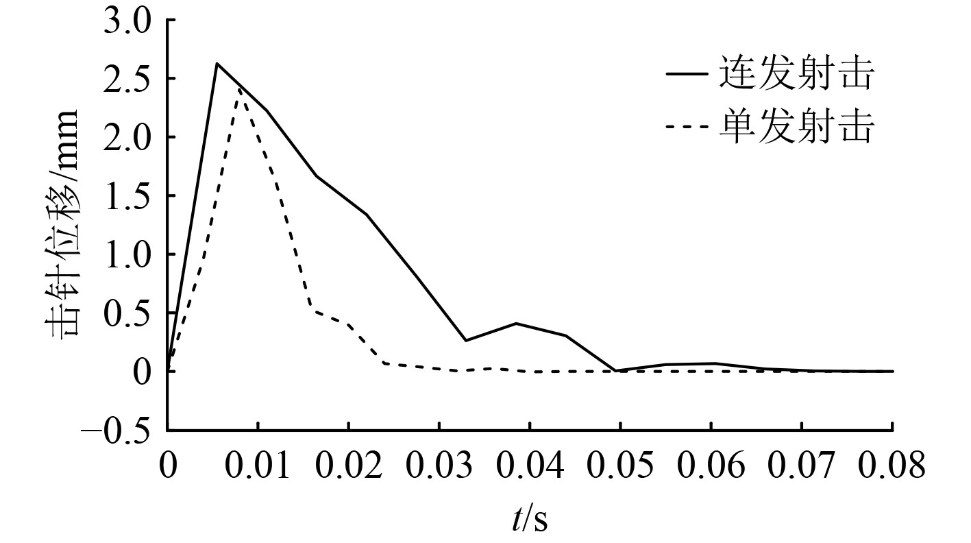 可知,击针位移迅速增大并达到最大值,继出现小幅震荡后,受击针复位簧作用回到初始位;单发射击的击针峰值位移为2.41 mm,连发射击的击针峰值位移为2.62 mm,满足底火正常发火要求。