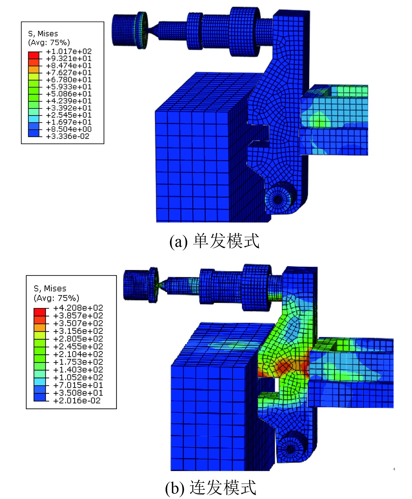 击发机构设计时,还应控制炮箱及击发杠杆的变形以实现可靠限位,消除限位不充分导致底火被击穿的风险。单发、连发射击模式下,击发瞬时的应力云图,如图5所示。