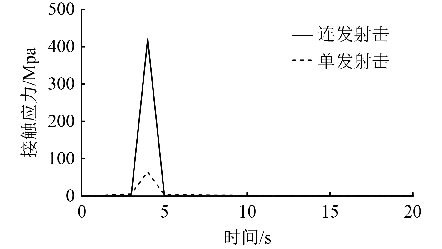 可知,单发射击时,击发杠杆与炮箱碰撞弱,几乎不存在接触应力;连发射击时,击发杠杆与炮箱碰撞强,存在较大接触应力。这是因为单发射击模式下各零部件的总动能较小,击发杠杆的动能不足以造成其与炮箱的强接触;连发射击模式下各零部件的总动能较大,底火的塑性应变仅消耗小部分能量,其余较大部分的动能在与炮箱碰撞后转化为相应的应变能。