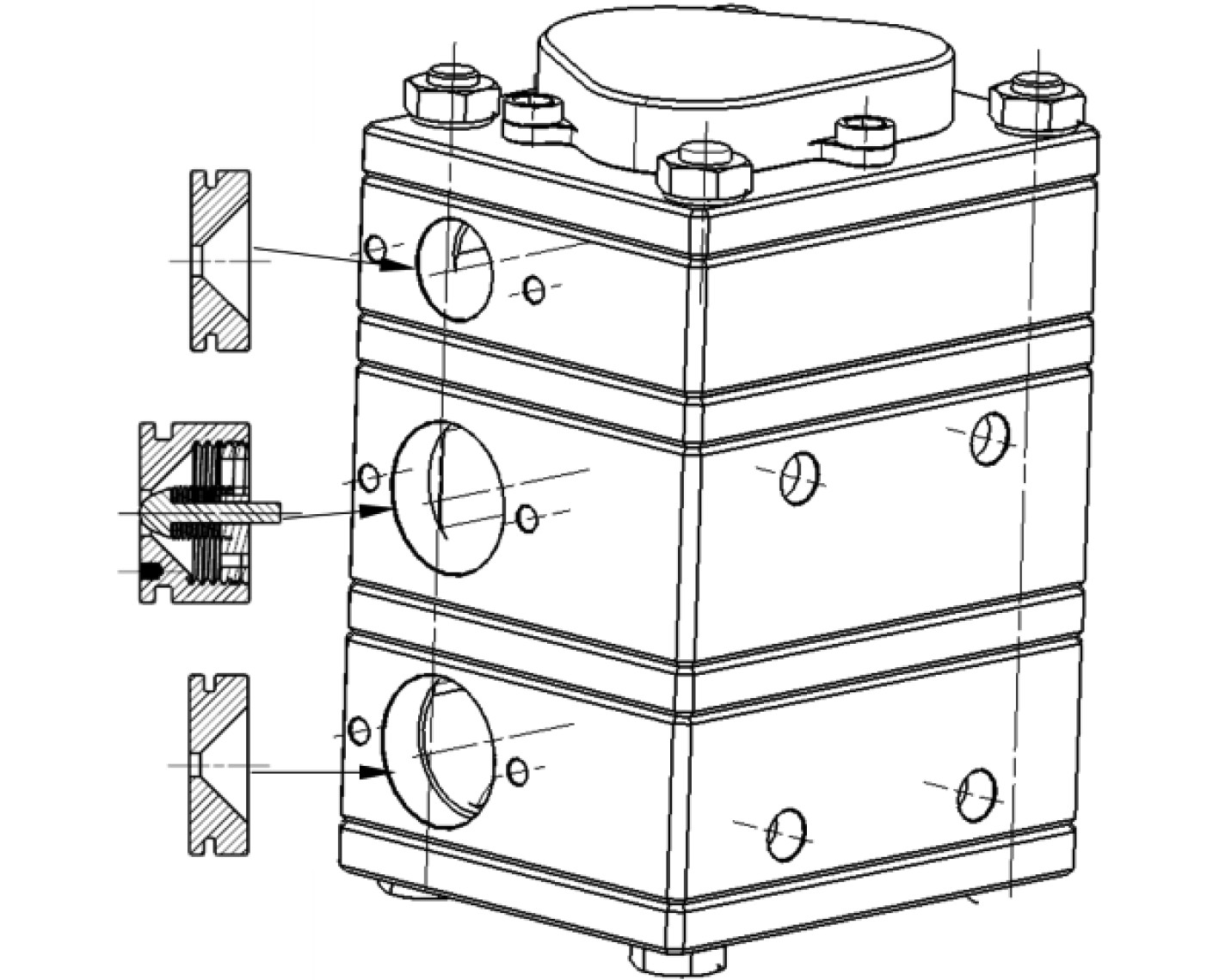 鱼雷实际工作时,推进剂的3路组元采用相互独立的压力供给方式,而且流经各组元管路系统的压力损失也不相同,导致3路组元进入比例控制器的压力产生差异,从而影响容积计量部件的内泄漏量,使得比例控制器的配比精度下降。为此,本文提出比例控制器3路入口均加装孔板(图2所示),而且在各组元流量工况下3路孔板的压力损失必须相同。三路孔板的压力损失计算式为: