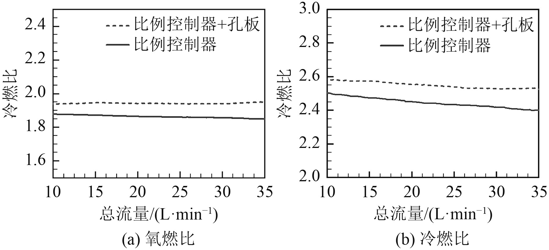 2)孔板提高了比例控制器氧燃比与冷燃比的稳定性,而且大流量工况下入口压力波动0.1 MPa时氧燃比与冷燃比的波动误差降至3%以内。