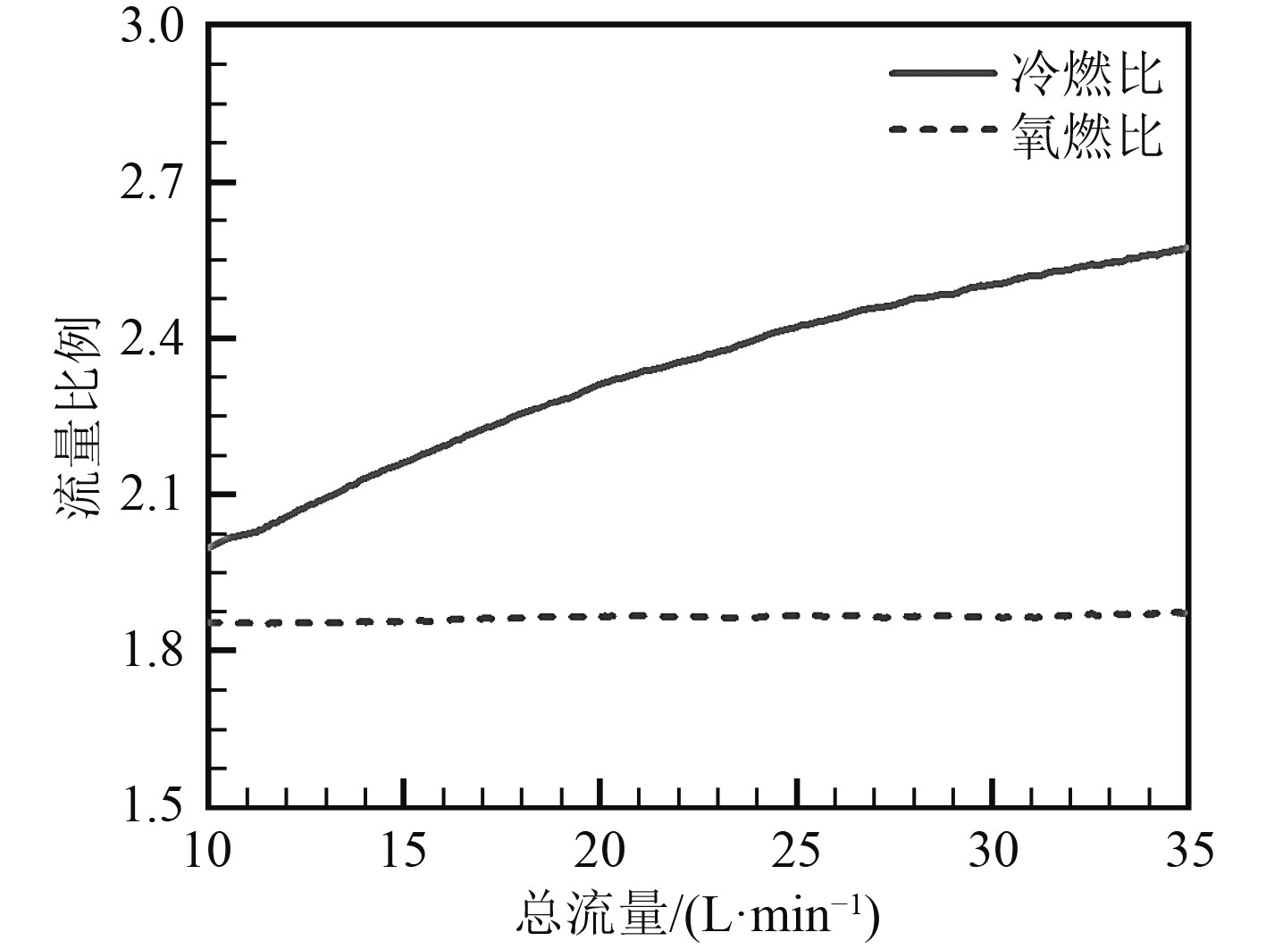 3)总流量从10 L/min逐渐增至35 L/min,比例控制器耦合自适应阀后冷燃比随之从1.95近似线性增长至2.6左右,同时氧燃比稳定在1.86左右;冷燃比与氧燃比在不同流量工况点均能保持稳定,从而保证热动力系统稳定运行。