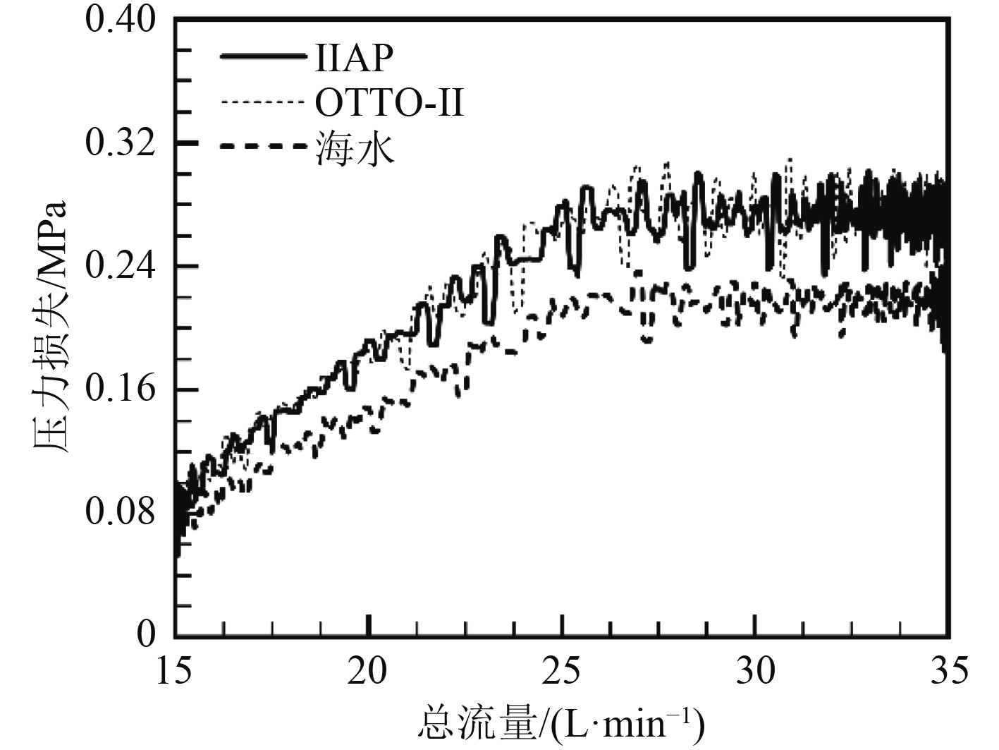 图8为变流量工况下比例控制器的3路压力损失。可知,总流量不断增大,比例控制器的3路压力损失随之增加,而且3路压力损失的变化趋势相似。小流量时,3路压力损失较为接近且近似呈线性增长,但OTTO-II的压力损失相对较小,当总流量增至26 L/min左右时,比例控制器的3路压力损失随总流量增大而缓慢增长,此时OTTO-II路的压力损失明显低于其他2路。