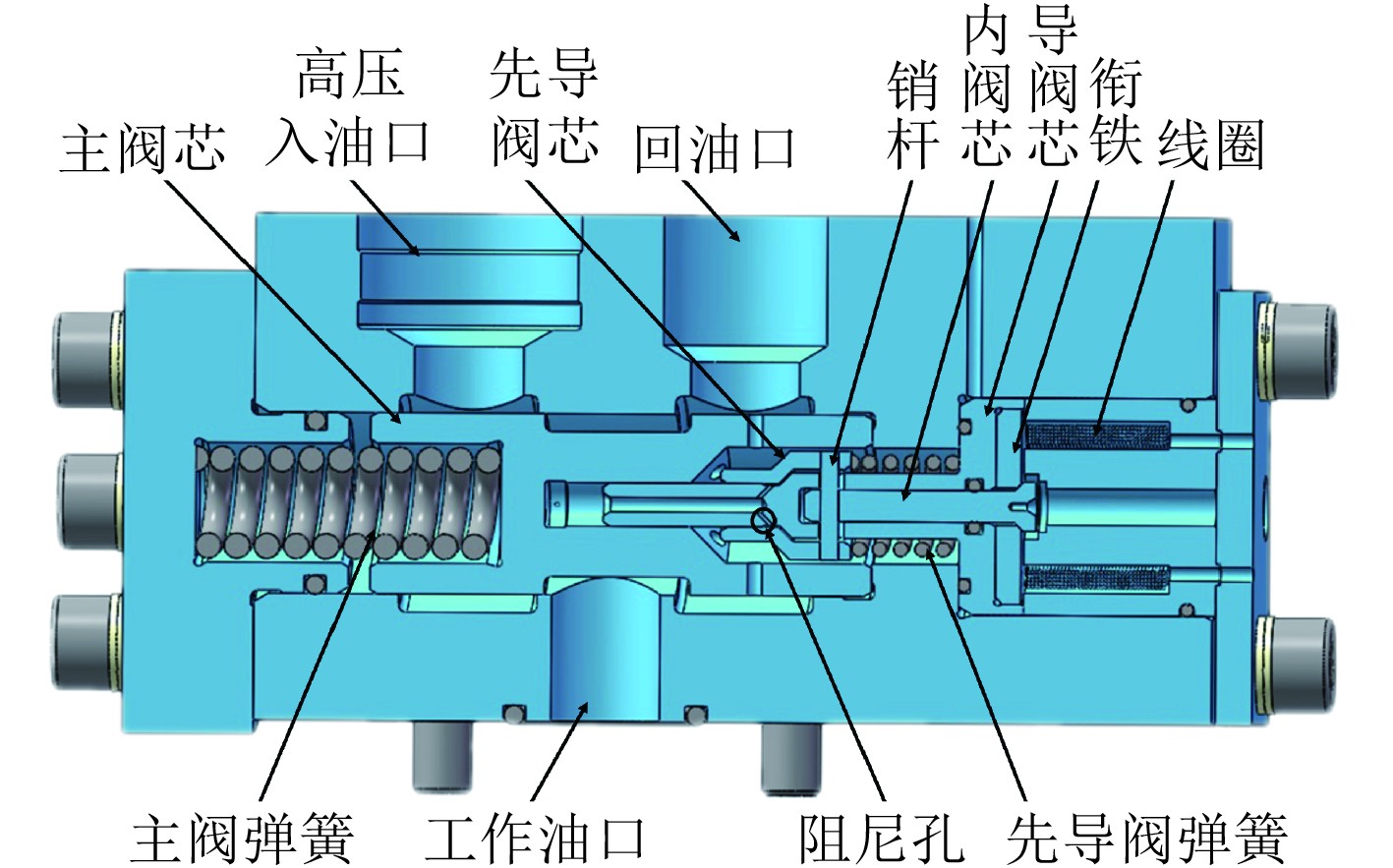 工作原理为:当电磁阀通电时,衔铁及先导阀芯组件(先导阀芯、销杆、内阀芯)在电磁力的作用下,克服先导阀弹簧的预紧力向右移动,直到先导阀芯与导阀芯的密封锥面压紧,此时液压油无法通过阻尼孔流出,使得主阀芯在控制腔液压力的作用下克服主阀弹簧的弹力向左移动。此时回油口关闭,高压入油口打开,并与工作油口相通;当电磁阀断电时,衔铁受到的电磁力消失,衔铁及先导阀芯组件在先导弹簧的回复力作用下向左移动,直到销杆左端与导阀芯压紧,此时控制腔中液压油通过阻尼孔经先导阀流向回油口,主阀芯在弹簧力的作用下向右移动,此时工作油口与回油口相通。