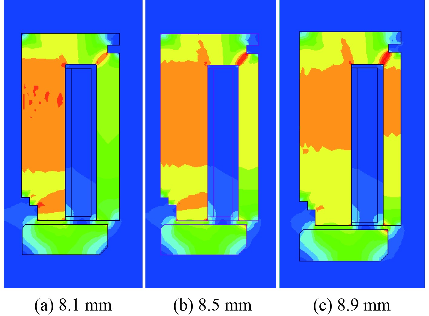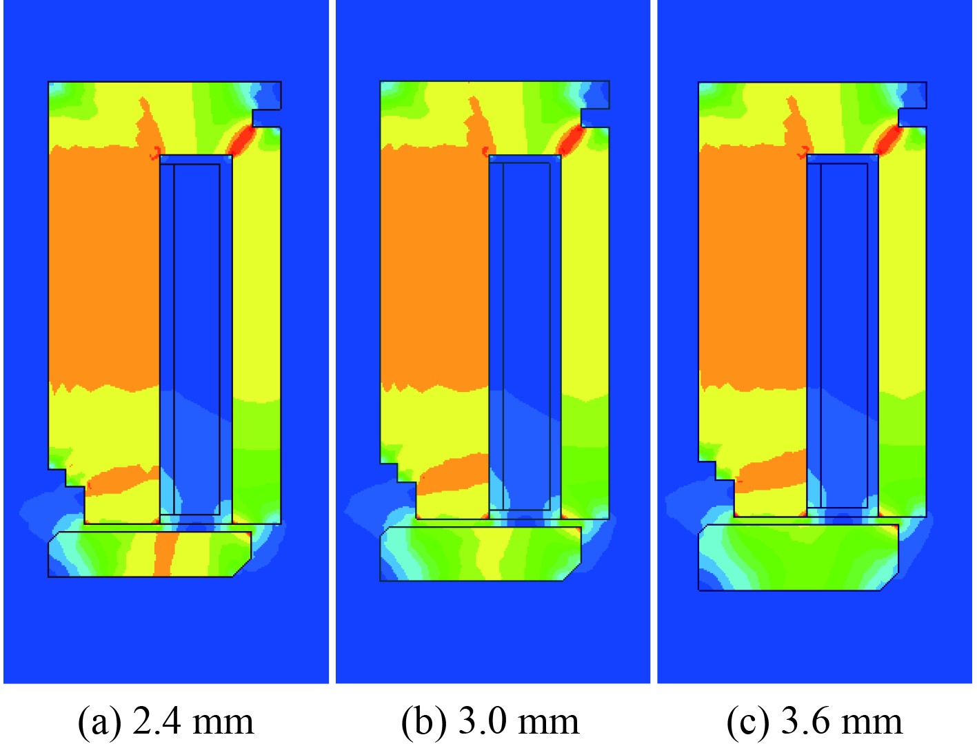 图 10 衔铁厚度与磁场强度分布的关系 Fig. 10 The relationship between the thickness of the armature and the distribution of magnetic field strength |