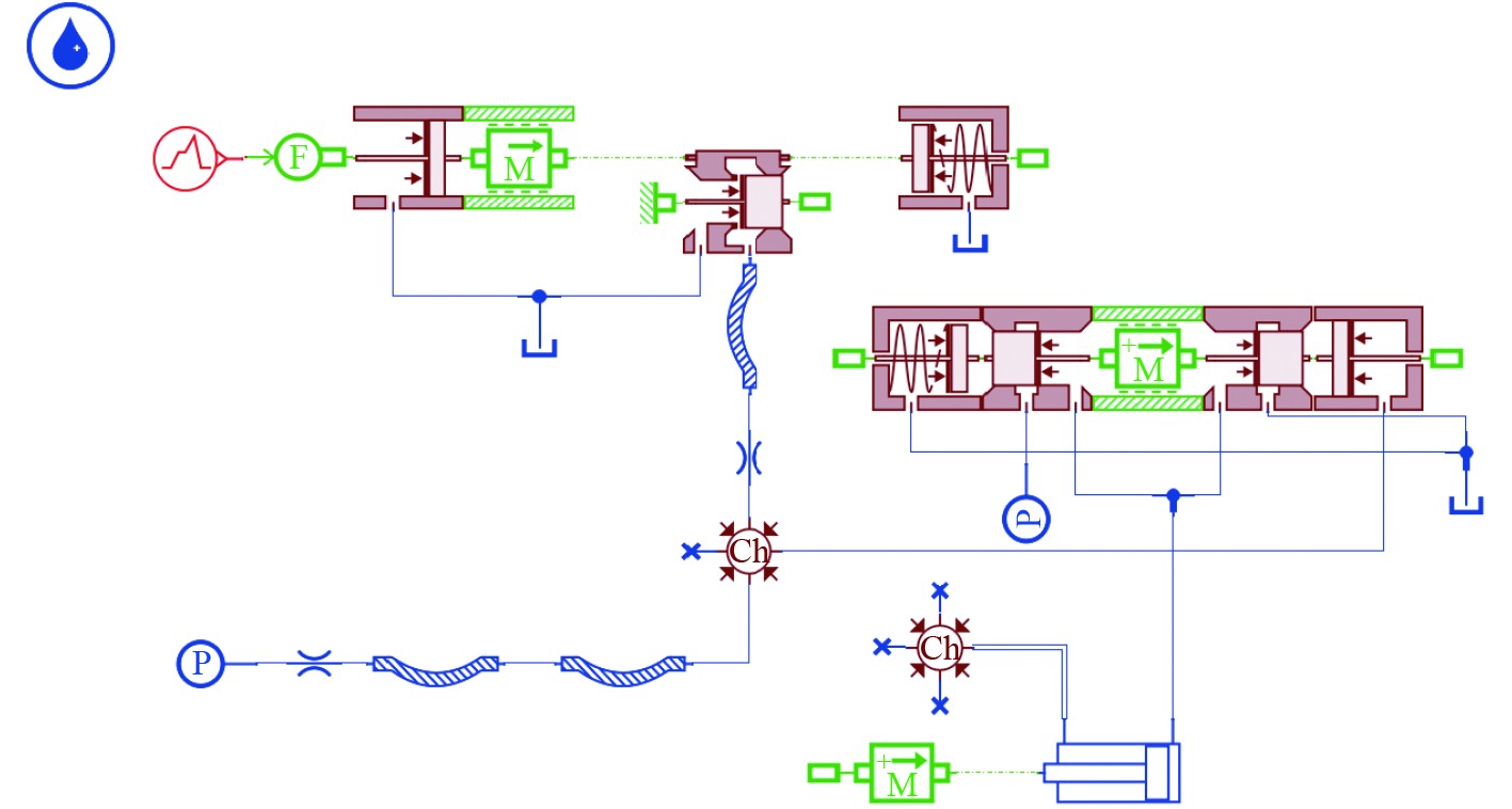 电磁铁在电磁阀中起控制先导阀芯运动的作用。当电磁阀通电时,电磁线圈产生磁场,该磁场中的衔铁与静铁芯产生吸引的电磁力。先导阀芯的运动是电磁力与先导阀弹簧力相互作用的结果,而其运动状态进一步决定了主阀芯的开启或关闭,从而实现对流体流动的精确调控。主阀芯起到控制流体流动、实现阀门启闭和维持密封的作用[8]。在主阀芯的高压入油口一端设计了通往阀腔的液压孔,在高压入油口未开启时,仍有部分高压油流入控制腔,而主阀芯的运动正是这一控制腔内液压力与主阀弹簧弹力相互作用的结果。对于船用氨发动机燃料喷射系统,电磁阀通过液压油流量信号控制燃料喷射体积,即氨燃料在喷射前需要进一步增压,以满足发动机的工作需求。基于AMESim仿真平台搭建了仿真模型。如图12所示。