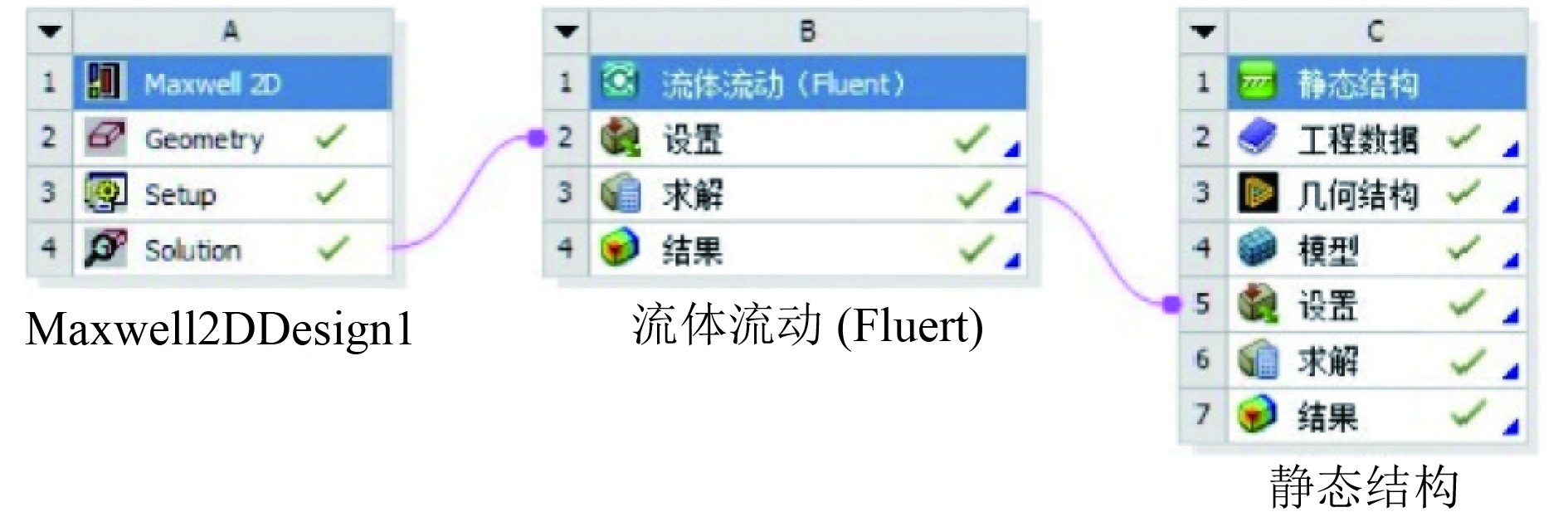电磁阀的多物理场耦合模型如图13所示,由Maxwell(A模块)计算电磁铁的电磁力、发热功率及在此过程中的铁损,将热损数据导入到流体仿真(B模块)中,Ansys首先计算电磁铁的温度分布,根据传热理论和热变形情况,计算温度场的分布,通过静力学(C模块)计算内部由温度变化而引起的电磁铁应力和变形。实现多物理场耦合的分析,此方法也克服了现有研究中温度和其他物理场在建模上不统一的问题。