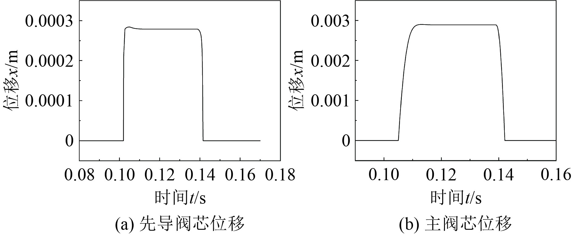 电磁阀通电后,先导阀芯组件克服弹簧力开始运动,随后主阀芯在两端压差的作用下移动。先导阀芯和主阀芯断电位移曲线如图所示。如图19所示,先导阀芯在通电2.2 ms后达到最大位移,行程为0.28 mm。主阀芯在通电12 ms后趋于稳定,行程为2.9 mm,此时液压油由高压入油口流向控制口。在断电1.6 ms后先导阀芯与主阀芯复位,液压油由控制口流向回油口。