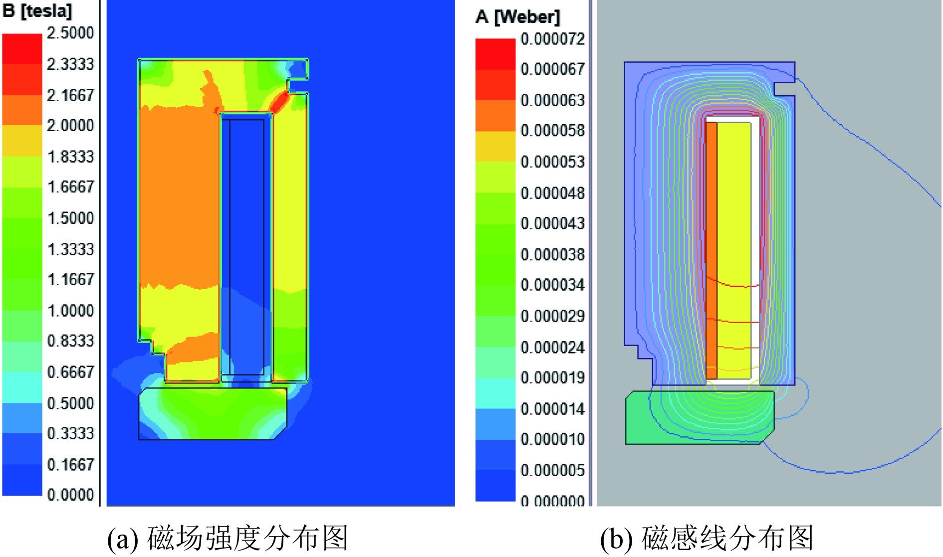 可知,主磁极半径侧的磁通量大于副磁极半径的磁通量,衔铁处的磁通量较低;在主副磁极中,靠近衔铁端的磁场强度比磁轭端的磁场强度要小;副磁极侧磁轭处磁感应强度较高,并且磁感线分布紧密,而衔铁内的磁感应强度较低,磁感线分布稀疏。