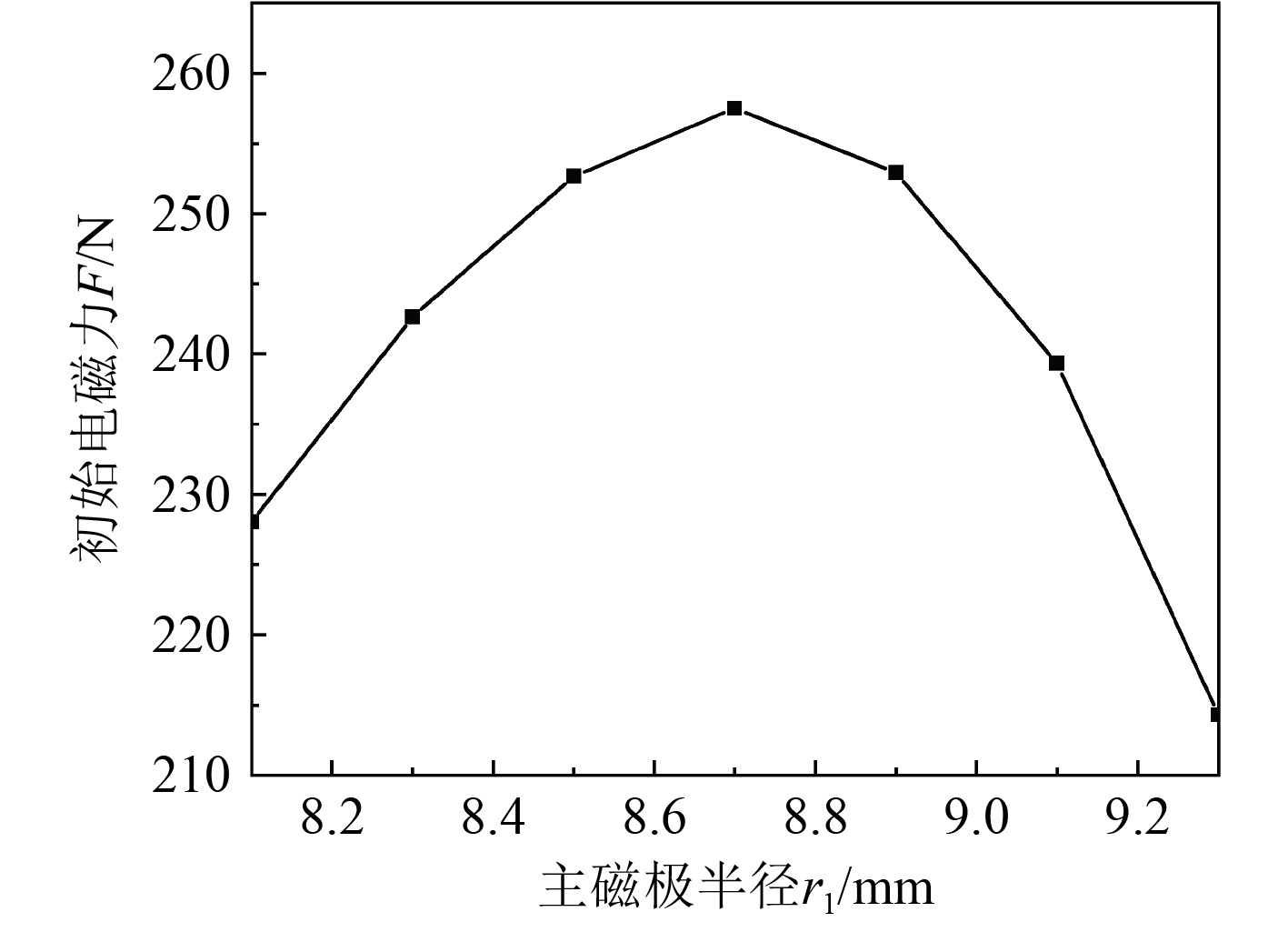 可知,当主磁极半径从8.1 mm增长到8.7 mm的过程中,初始电磁力持续增长,保持上升趋势;从8.7 mm增长到9.3 mm的过程中,初始电磁力缓慢降低,处于下降趋势;初始电磁力峰值位于主磁极半径8.5~8.9 mm区间内。