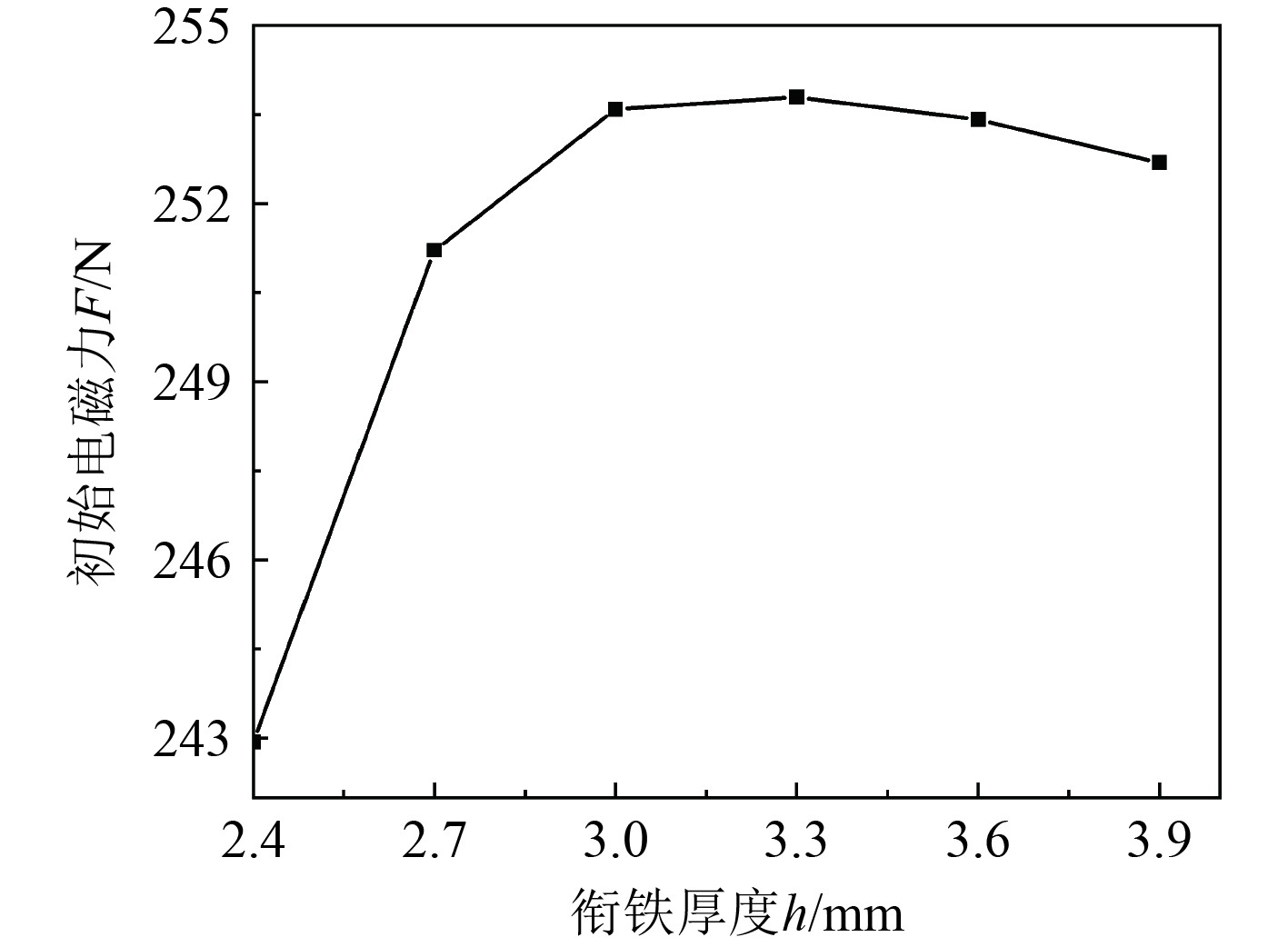 可知,随着衔铁厚度的增加,初始电磁力呈现先增加后减少的趋势。衔铁厚度从2.4 mm增加至2.7 mm时,电磁力从242.9 N增加至251.2 N,增加速度较快;继续从2.7 mm增长至3.3 mm的过程中,增长速度减缓,衔铁厚度增加0.6 mm,初始电磁力仅增加2.6 N;而在衔铁厚度从3.3 mm增加至3.9 mm的过程中,衔铁所受初始电磁力呈现缓慢下降趋势。