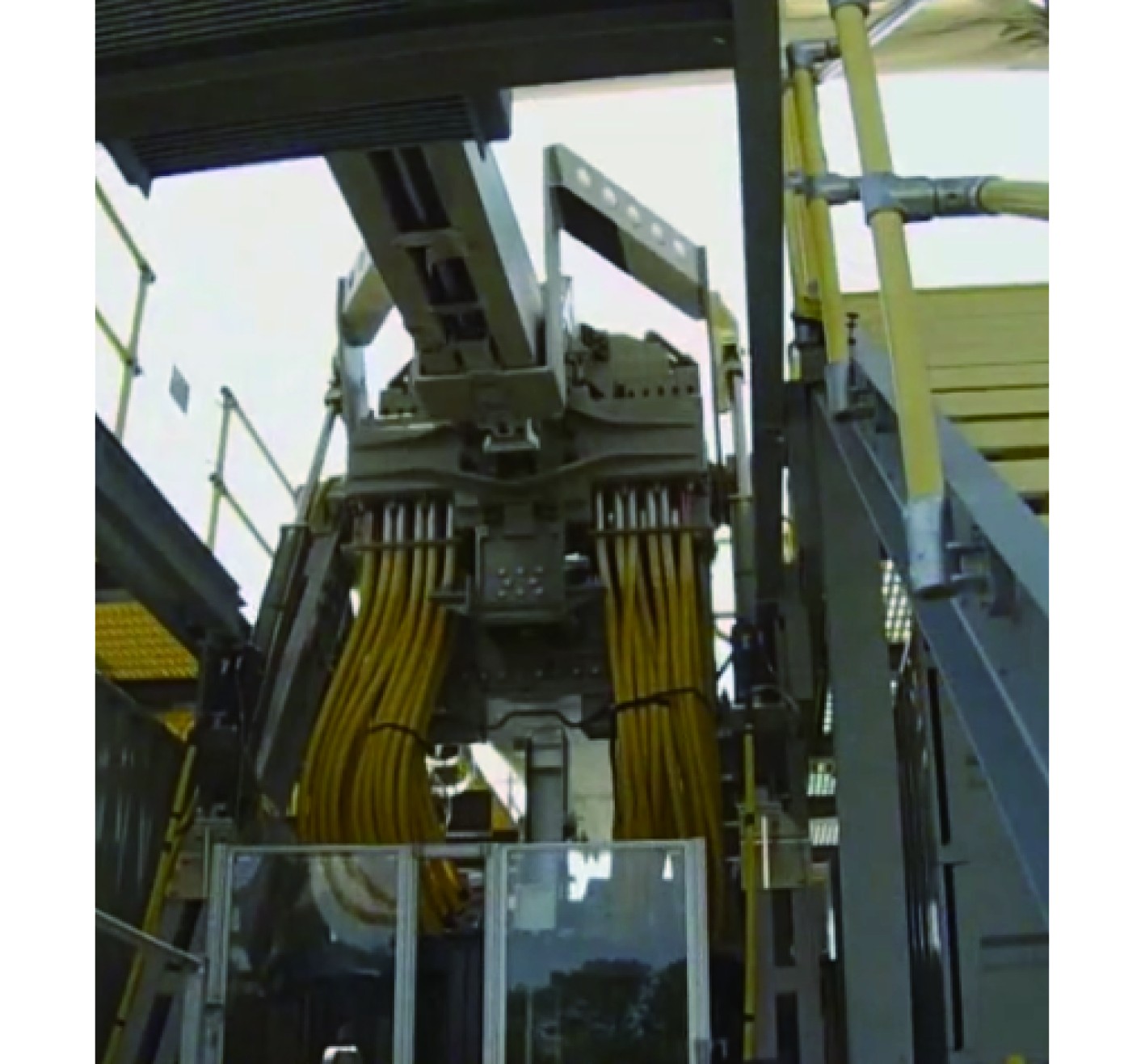 电磁发射装置依靠脉冲大电流代替火药将弹丸发射,发射过程中须保证电流回路的可靠连接[1 − 3],目前通常采用同轴电缆形式进行电流传导,大规模同轴电缆从电源系统敷设到发射系统炮尾汇流装置上[4],其汇流装置与身管采用硬连接方式,二者无法相对转动,即炮尾汇流装置将带着数量众多的同轴电缆随着身管同步进行高低和方位随动。同轴电缆系统运动产生的阻力[5],会对随动系统产生严重干扰,同时受制于在狭窄空间内电缆的敷设路径和方式,以及发射系统俯仰和回转需求,电磁发射装置往往体积过于庞大,且限制发射系统运动范围,直接影响武器装备轻型化和战斗力提升,图1为美国某电磁发射装置同轴电缆布局。