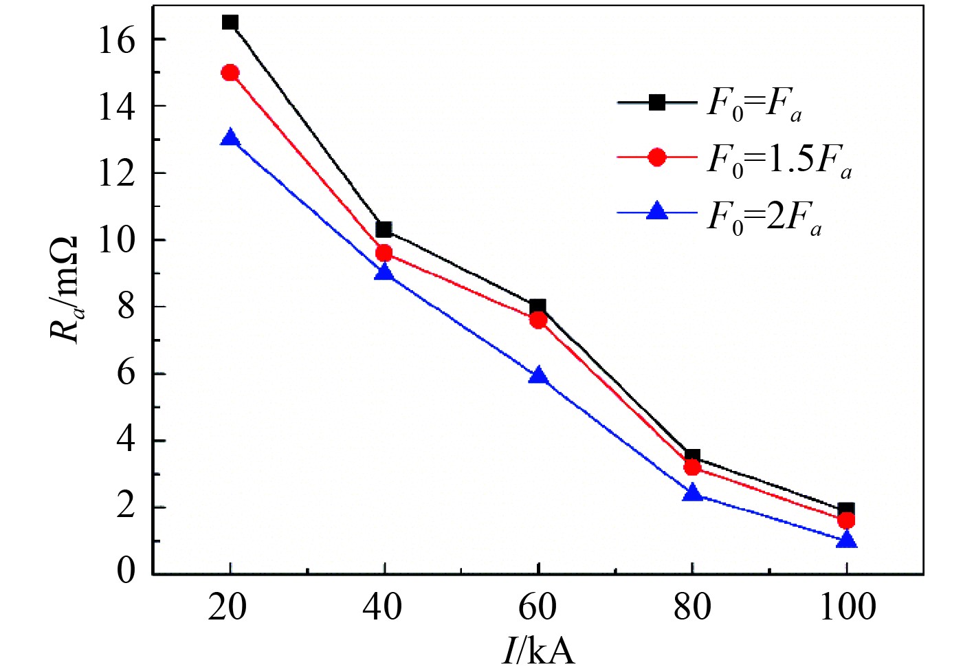 1)实验室环境下,100 kA及以内幅值脉冲大电流工况下,F≥Fa时,电流传导界面接触特征稳定,脉冲大电流传导密度最大达到1348.8 A/cm2,接触电阻不大于16.5 mΩ。