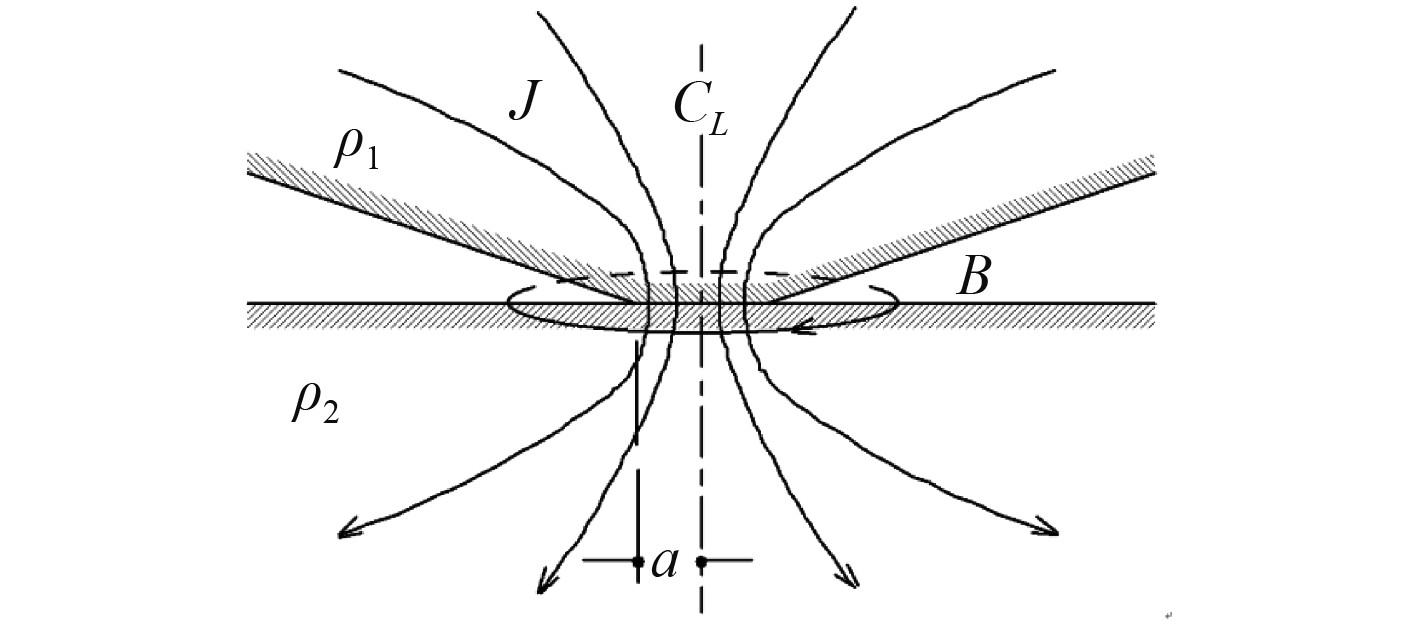 接触面间的接触压力越大,每一接触点的半径就越大,其接触电阻就越小,如图2所示。其中,a为接触区域半径;J为电流密度;ρ1、ρ2为两接触材料电阻率;B为磁感应强度;CL为电刷接触中心线。当电流从一种导体流向另一导体时,接触点内部的电流流动路径如图3所示。