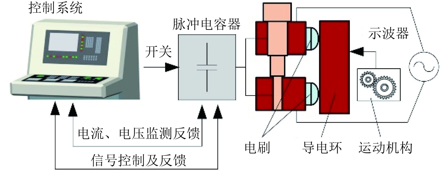 2 试验过程 2.1 试验原理在实验室环境下对电刷-导电环接触副进行脉冲大电流传导试验,原理如图5所示。脉冲电容器主要为电路回路提供毫秒级高能单脉冲电流。其中,放电主回路包括高密度脉冲电容器、控制系统、电刷-导电环。控制系统操控电源向脉冲电容器进行恒流充电至给定电压,随即触发脉冲电容器开关,将脉冲电容器迅速和电路连通,完成放电过程。