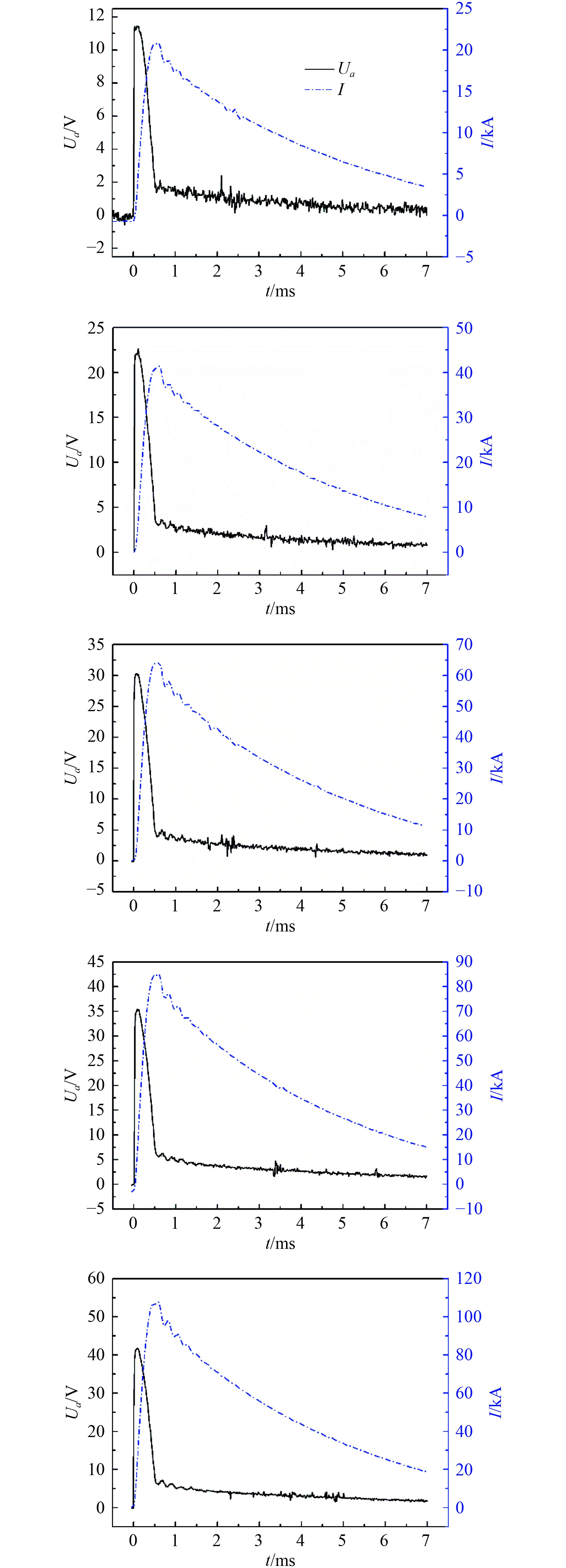 本次电刷结构共施加了20、40、60、80、100 kA共5种不同幅值脉冲电流,每种电流工况条件下电刷-汇流环间设置初始压力,图7为5种电流工况下的电流试验数据以及监测到的正负极电刷两侧电压试验数据。