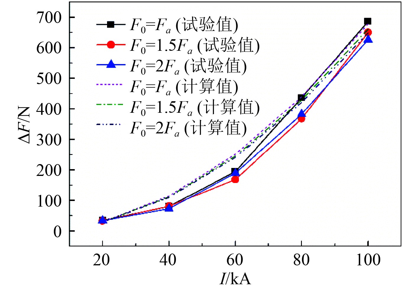 结合式(1)~式(2)对不同接触压力下的电磁斥力进行计算。结合试验数据对不同电流、不同初始接触压力工况下电磁斥力进行统计,最终得到图9结果。其中,Fa为初始接触压力,与传导脉冲电流幅值相关[1];μ=9.8。