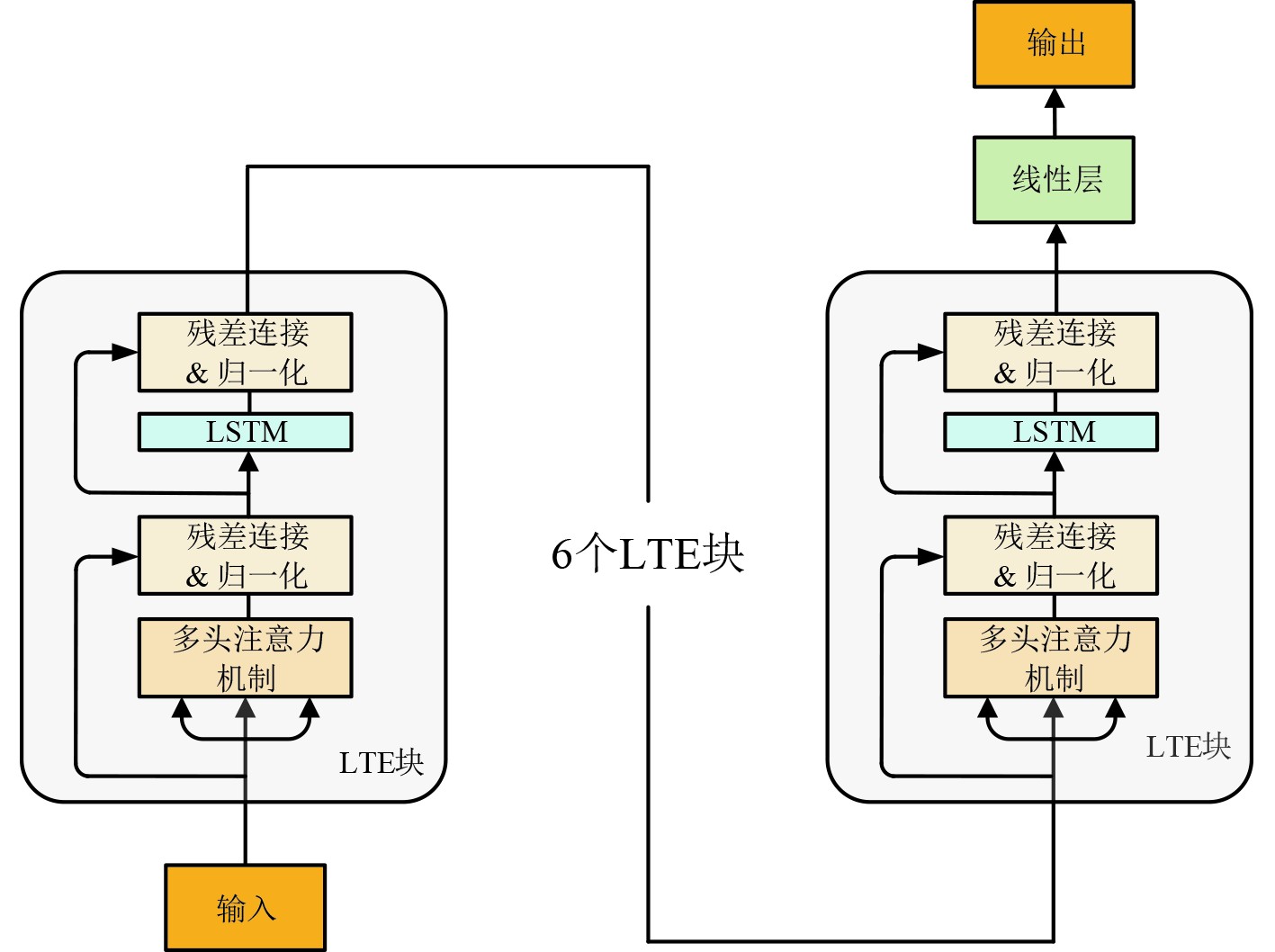 考虑到LSTM具有可以捕捉时间序列的特征,而在Transformer Encoder中经过注意力机制后的运算本质上也是一个序列,因此理论上可以融合2种模型,得到一种新方法,基于此提出了一种LSTM-Transformer Encoder模型,记为LTE模型,网络结构如图11所示。在Transformer Encoder模型中,每个self-attention层后面都有一个前馈网络,通常是2个全连接层之间夹着一个激活函数,LTE模型将前馈层(Feed Forward)替换为LSTM层,意味着在注意层的输出之后,直接将这个输出传递给LSTM层,而不是全连接层。LSTM具备捕获长时间依赖和序列信息的能力,因此在具有较强时序特性的任务中,可以提高模型有效性,这种组合可以利用自注意力机制的高效并行性,同时保留LSTM对时间序列的建模能力。本文期望通过这种组合,保留LSTM方法整体效果的同时,在部分表现不如Transformer Encoder方法的节点处有更优表现,下文中对LTE模型和LSTM、Transformer Encoder模型进行对比论证,分析验证LTE的可靠性。