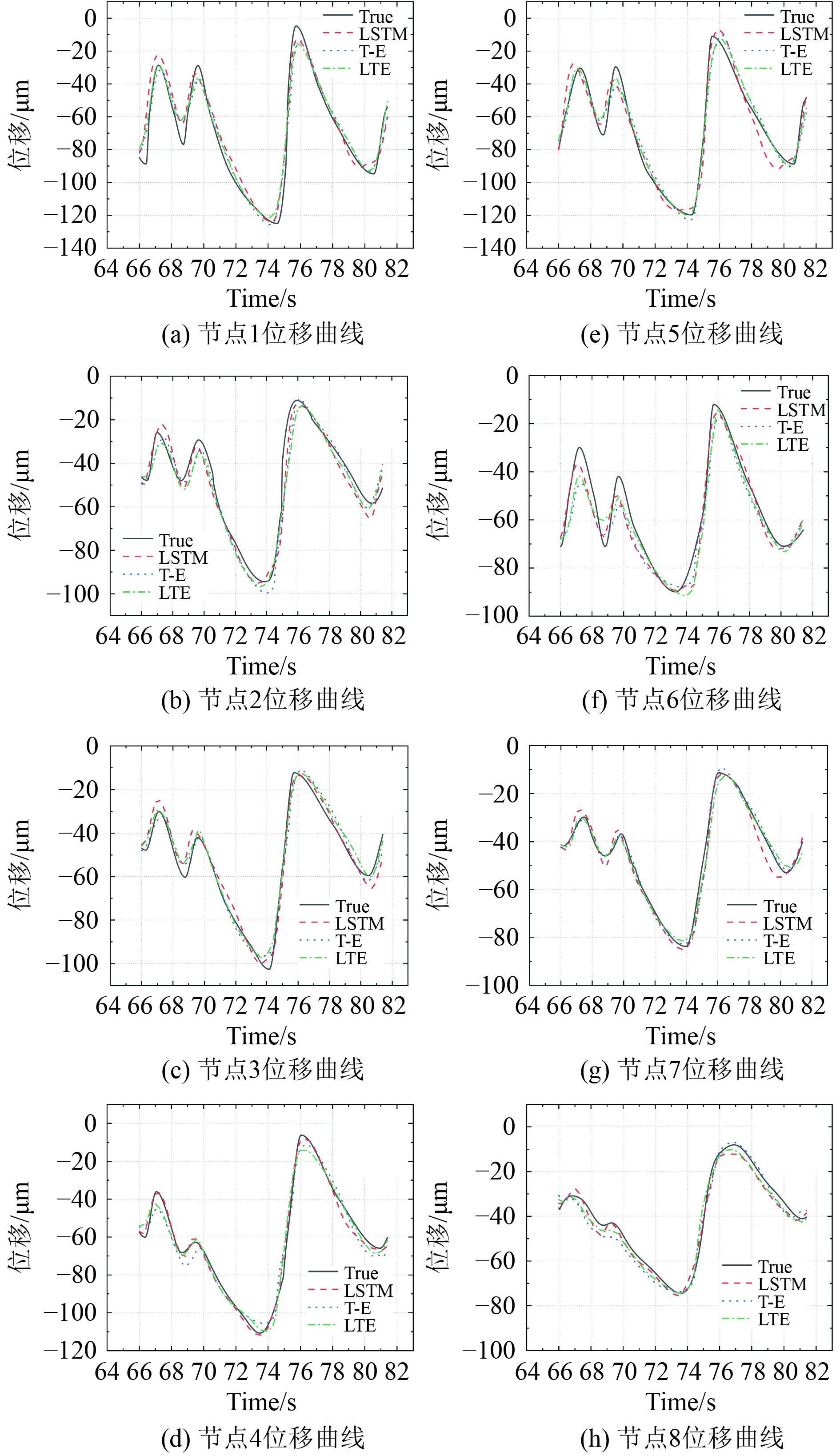 使用LTE网络对槽型结构动态变形进行重构并与LSTM、Transformer Encoder和实际实验结果进行对比,如图12所示。图中True为实验测试结果的测试集数据。
