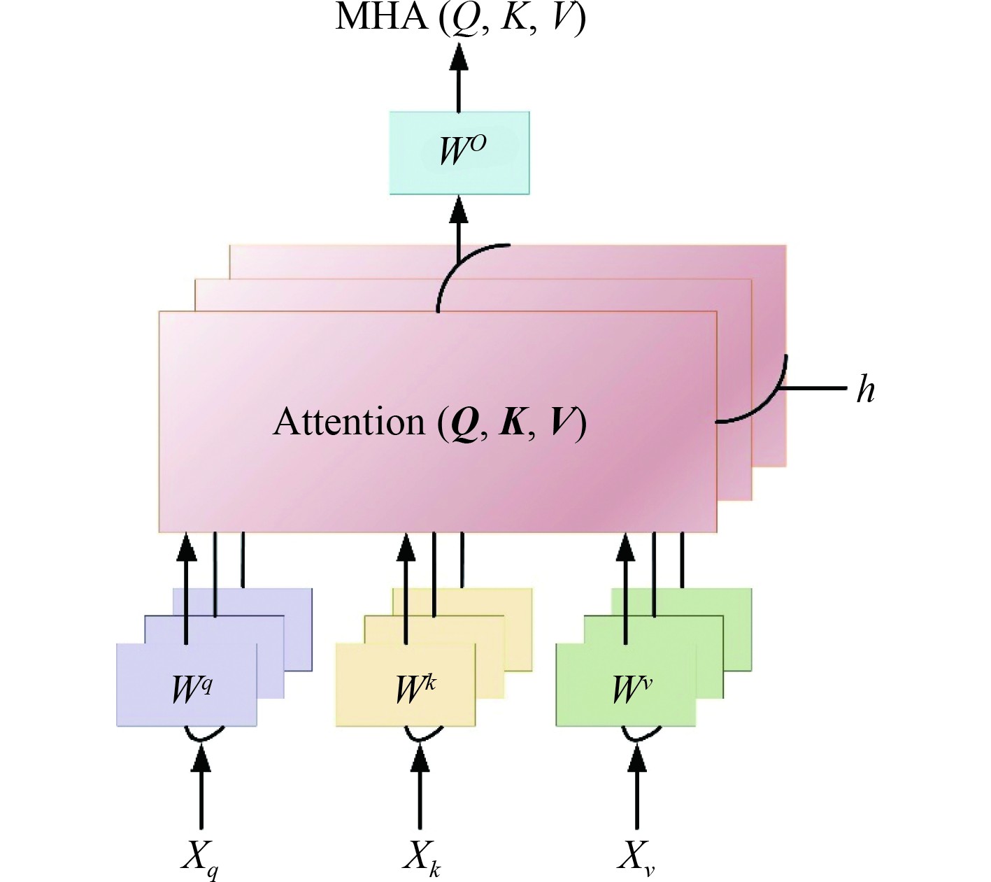 | $ MHA({\boldsymbol{Q}},{\boldsymbol{K}},{\boldsymbol{V}}) = concat({H_1},{H_2},...,{H_h}){W^O}。$ | (9) |