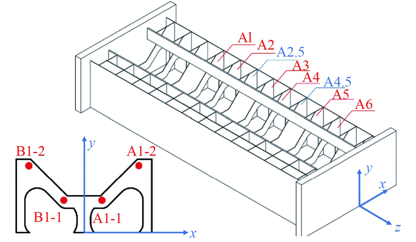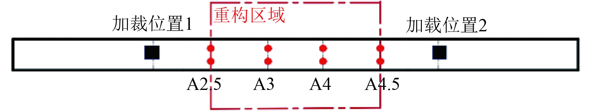 槽型结构侧板如图5所示,材料为7 mm厚的Q235钢,侧板方框内的区域为槽型结构变形重构区域,加载位置1、加载位置2为受载区域,重构区内的侧板根据横向构件M型板和密封板的位置分为A2.5、A3、A4、A4.5这4个档位,每个档位上有2个位移测点,重构区域内共有8个位移测点。