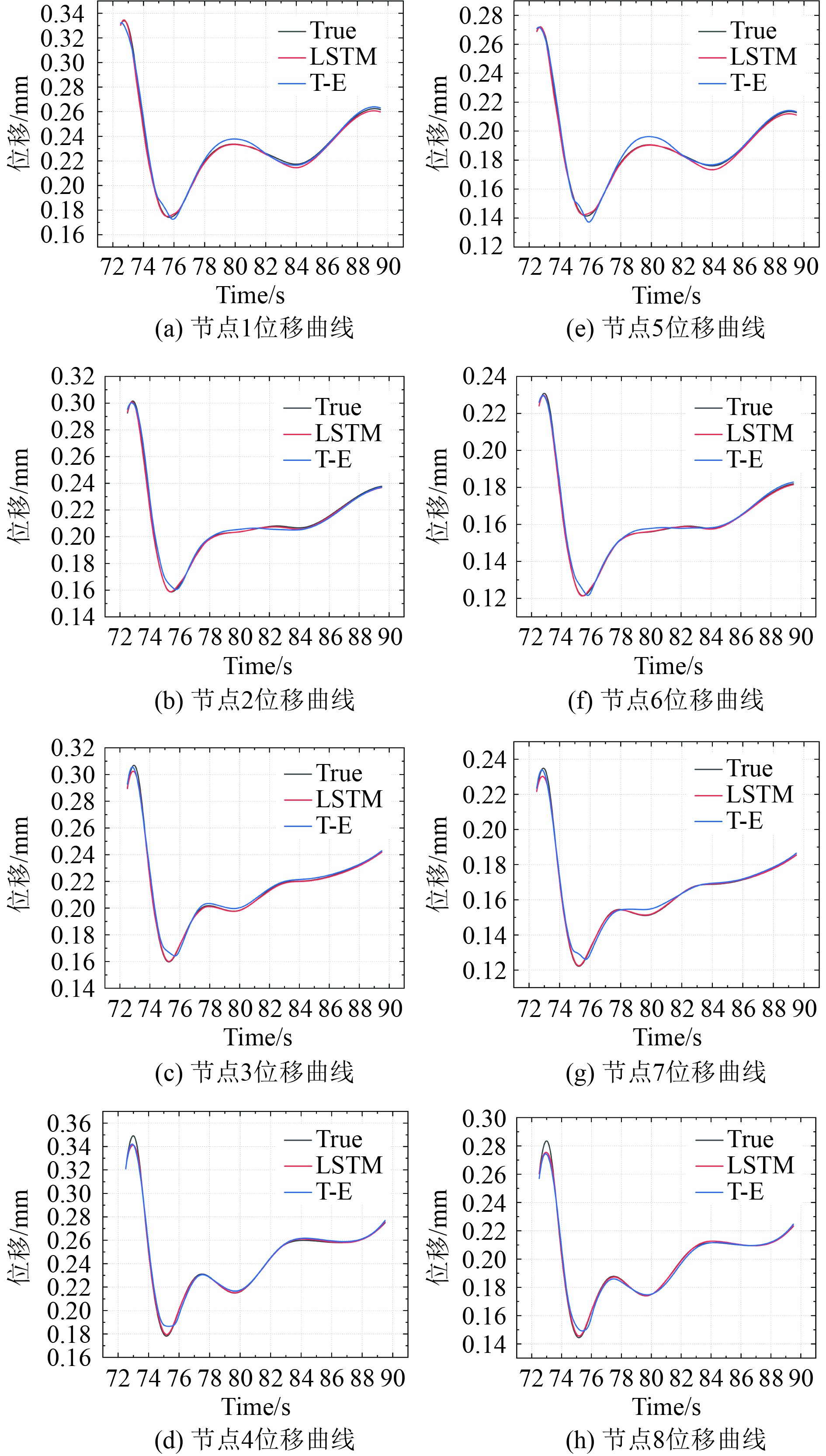 3.2 实验验证对于应变-位移数据采取2.2节中的方法构造20×20输入——8输出的样本,并按8:2的比例划分为训练集和测试集。使用LSTM、Transformer Encoder这2种网络对实验测试集数据进行预测,并与激光位移传感器的监测结果进行对比。2种算法各节点的平均相对误差如表3所示,LSTM最大平均相对误差为14.89%,Transformer Encoder最大平均相对误差为15.18%,2种算法的最大平均相对误差对应的节点均为节点1。实验拟合系数如表4所示。