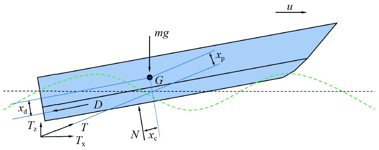 图 1 滑行艇在波浪中受力示意图 Fig. 1 The schematic diagram of forces acting on planing hull in waves |