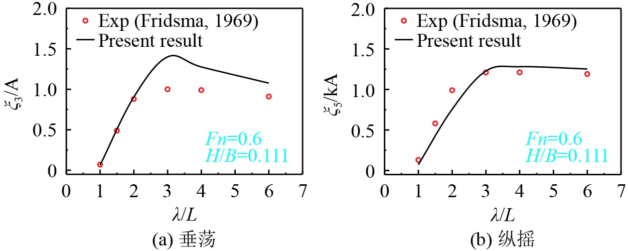 图10为Fridsma滑行艇在航速Fn=0.6时的垂荡与纵摇运动结果,数值结果与试验数据[20]趋势吻合较好,进一步验证了本文数值方法的准确性。
