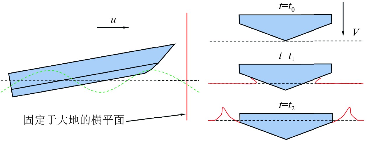 滑行艇的各个横剖面随时间推移依次穿过该横平面:假设初始时刻t=t0,滑行艇的横剖面尚未入水,此时正穿过横平面,相当于剖面恰好位于自由面上方;随时间推移,t=t1时刻的横剖面接触自由面,折角线未浸湿,称为干折角线情况(dry chine);t=t2时刻的横剖面折角线浸湿,流动在折角线处发生分离,称为湿折角线情况(wetted chine)。因此,研究高速滑行艇在波浪中的运动问题转化为在固定于大地的横平面视角下的剖面入水流动问题,该方法的关键在于剖面入水过程中水动力的计算。
