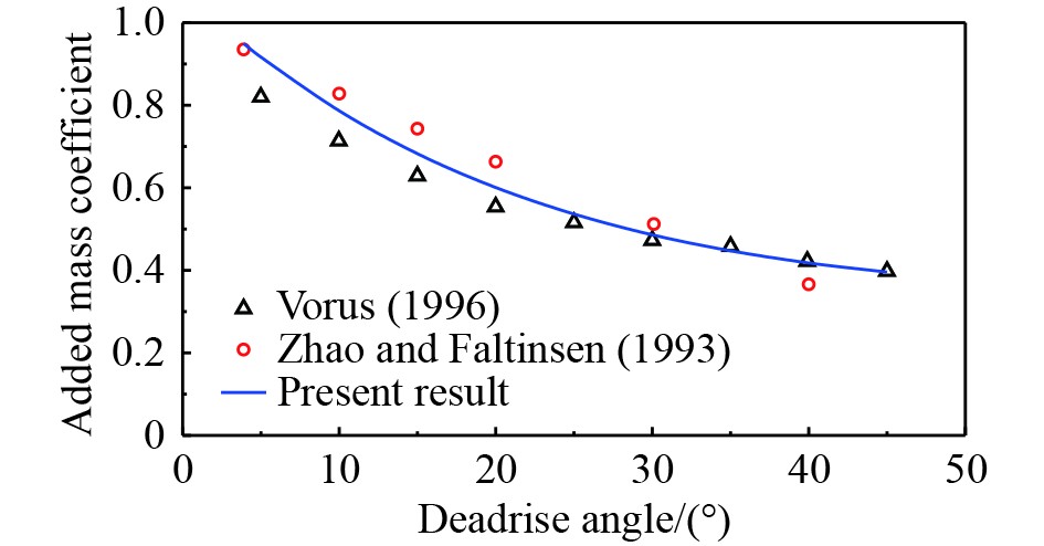 图 3 楔形体的附加质量系数比较 Fig. 3 The comparison of added mass coefficient for wedge |