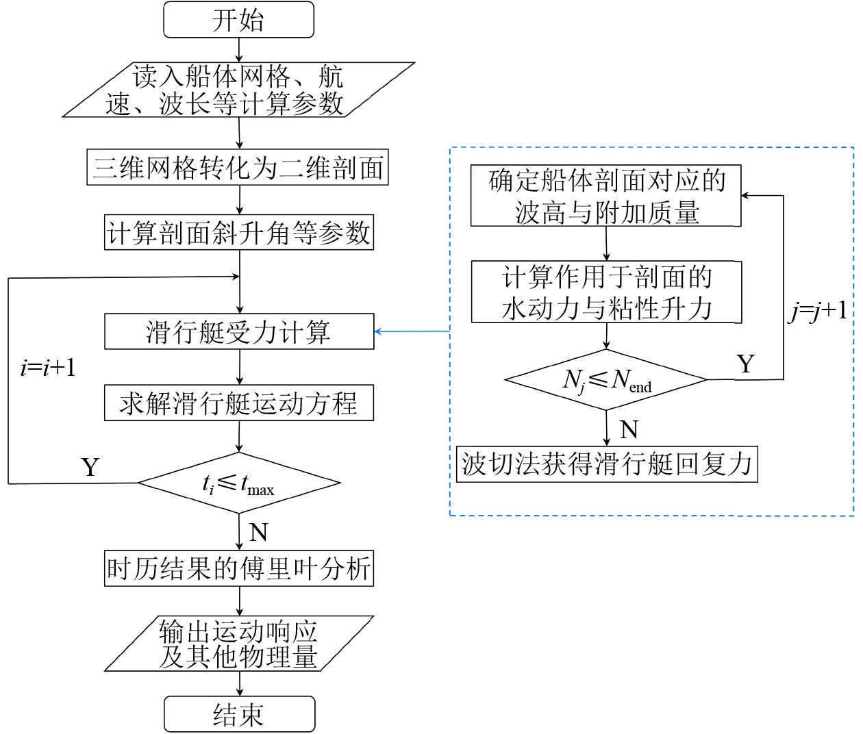 图 4 高速滑行艇时域运动计算流程图 Fig. 4 Flow chart of computing time domain motion of high-speed planing hull |