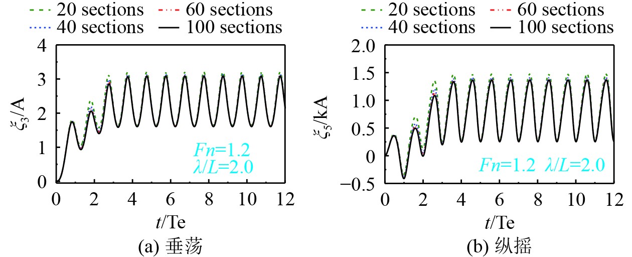 图 6 不同剖面数量对应的Fridsma滑行艇运动时历 Fig. 6 The time series of motion of Fridsma planing hull for different sections |