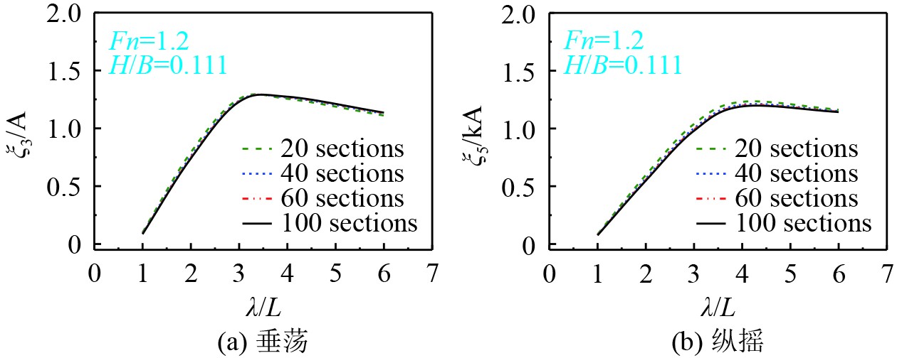 图 7 不同剖面数量对应的Fridsma滑行艇运动响应 Fig. 7 The motion responses of Fridsma planing hull for different sections |
