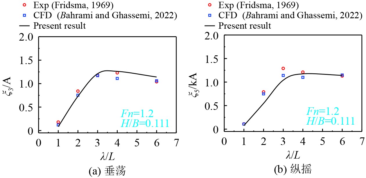 图8与图9为本文采用2D+T方法计算Fridsma滑行艇在航速Fn=1.2时迎浪工况下的垂荡与纵摇运动结果,同时与试验数据[20]和BAHRAMI等[21]基于CFD模拟获得的结果的对比。可以看出,本文数值方法计算的纵摇运动与试验结果吻合良好;对于垂荡运动,数值预报结果的变化趋势与试验值相一致,但是大波高工况下的垂荡峰值预报结果偏大。