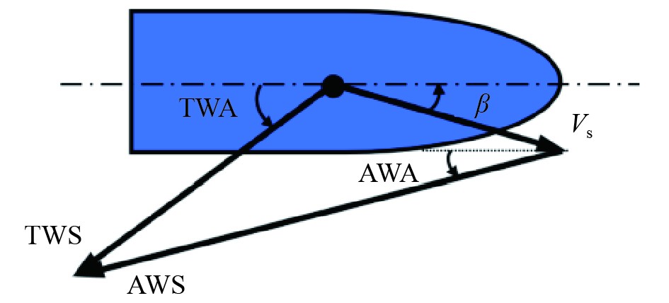 图 10 真实风速TWS、真实风向TWA、感知风速AWS、感知风向AWA之间的向量关系 Fig. 10 The vector relationships between True Wind Speed (TWS), True Wind Angle (TWA), Apparent Wind Speed (AWS), and Apparent Wind Angle (AWA) |