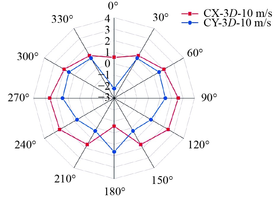 图 11 TWS=10 m/s风速3D布置方案旋筒风帆的空气动力系数 Fig. 11 The aerodynamic coefficient of the rotating sail with a wind speed of TWS= 10 m/s in a 3D layout scheme |