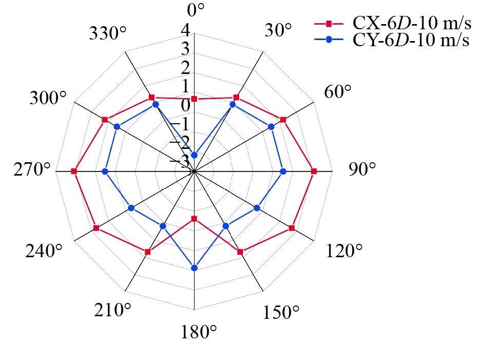 图 12 TWS=10 m/s风速6D布置方案旋筒风帆的空气动力系数 Fig. 12 The aerodynamic coefficient of the rotating sail with a wind speed of TWS = 10 m/s in a 6D layout scheme |