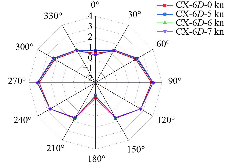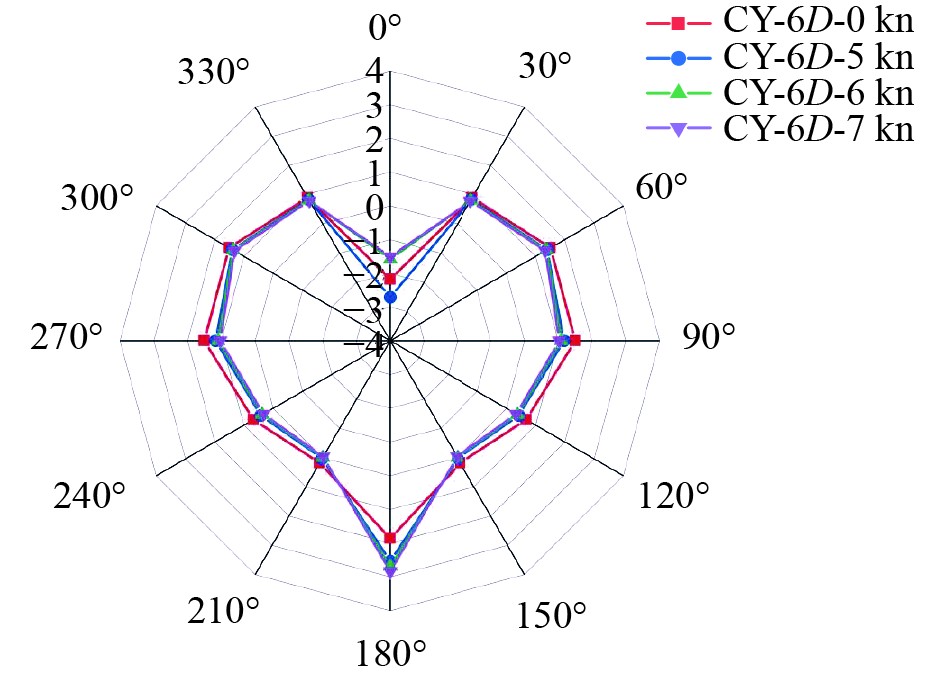 图 14 TWA=10 m/s不同航速下6D布置方案旋筒风帆的侧向力系数 Fig. 14 The lateral force coefficient of the rotating sail in a 6D layout scheme at different sailing speeds with TWA = 10 m/s |