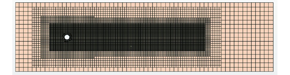 本文需要对旋筒风帆附近以及尾部流场的网格进行加密,于是在这2处创建2个加密区域。使用表面修复、切割体网格和棱柱层网格对计算域进行网格划分,非加密区域的网格基本尺寸设置为1.0 m;面网格增长率设置为1.3;棱柱层设置为12层;棱柱层总厚度设置为基本尺寸的2%;最大网格单元尺寸设置为相对基数的6.25%;网格数量133万,如图2所示。