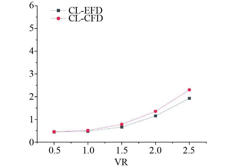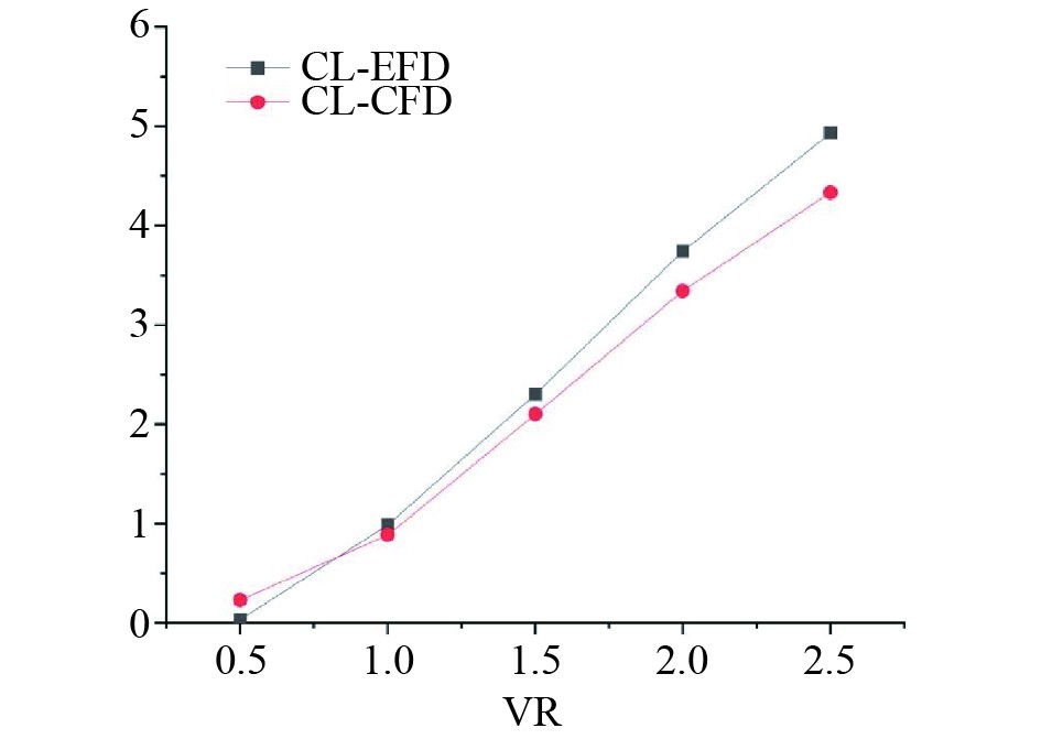 采用上述计算方法对单个模型尺度的目标旋筒风帆数值计算,得到风速10 m/s时,不同转速比下旋筒风帆的升力系数及阻力系数,对比风洞模型试验数据,如图3和图4所示。转速比定义是旋筒风帆转筒表面线速度与风速比值[13]。