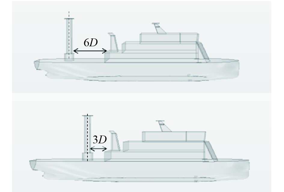 旋筒风帆与上层建筑的距离定义为旋筒风帆轴心与上层建筑最靠近船艉平面之间的间距,该小节对旋筒风帆布置方案的探索性研究以及结合目标船舶艉部的甲板尺寸,2种布置方案分别为旋筒风帆距离上层建筑3D和距离上层建筑6D,如图7所示。
