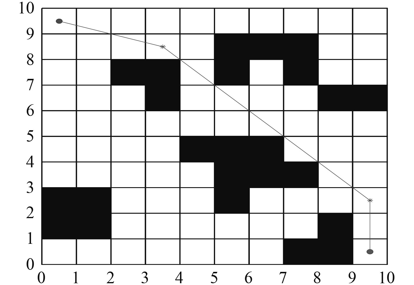 传统蚁群算法在寻找最优路径时,由于单步搜索的缘故,规划出的路径可能会在无障碍区域产生大量拐点导致路径较为曲折,使得无人艇路径出现多余的转向。为此,本文采用删除冗余点的方式来尽可能减少路径规划中的拐点,减小路径的曲折程度。如图1和图2所示,在10×10的栅格地图中按照直角坐标系原则记路径点(0.5,9.5)为