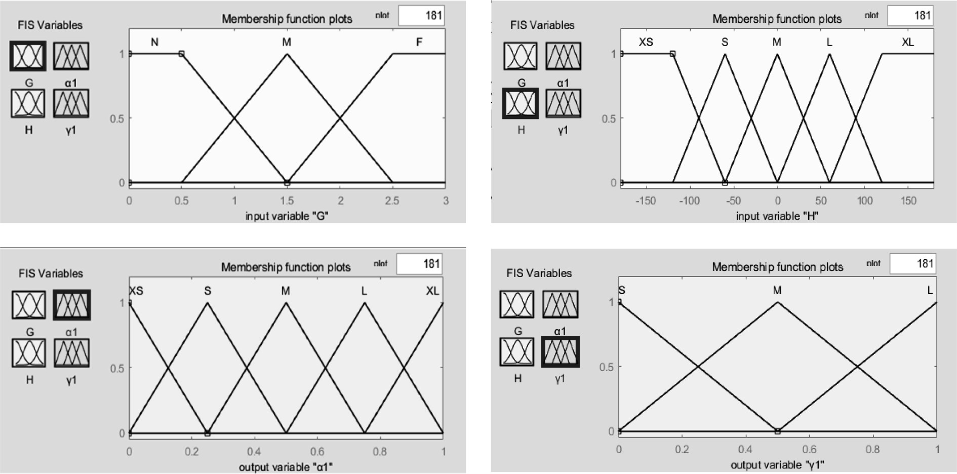 1)方向模糊控制器输入变量为G、H;输出变量为