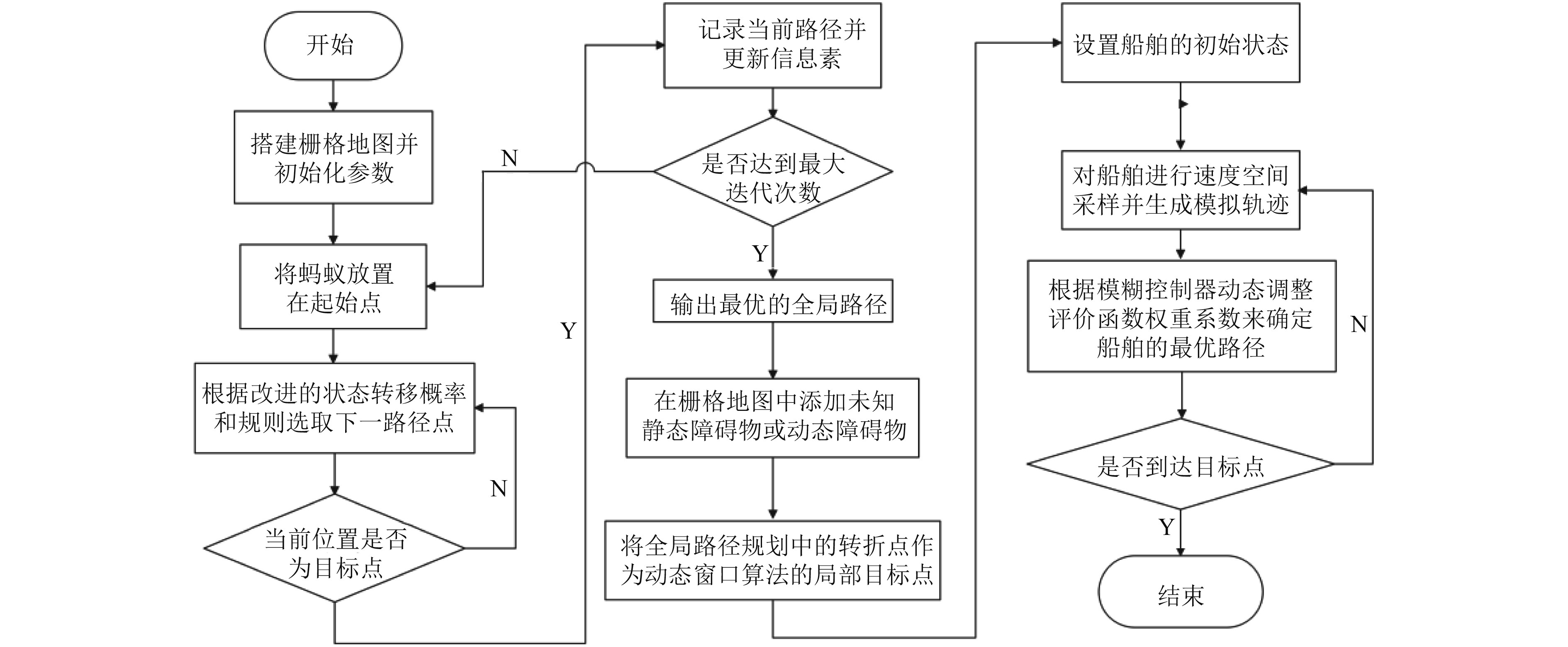 3 融合算法及仿真实验分析 3.1 融合算法流程本文将改进后的蚁群算法与基于模糊控制的动态窗口法融合,将蚁群算法规划出的全局路径转折点作为动态窗口法的局部目标点,使得融合后的算法不仅可以根据已知环境规划出全局最佳路径且可以规避多个未知静态障碍物和动态障碍物,使得无人艇安全快速的抵达目标点。融合后的路径规划算法流程如图6所示。