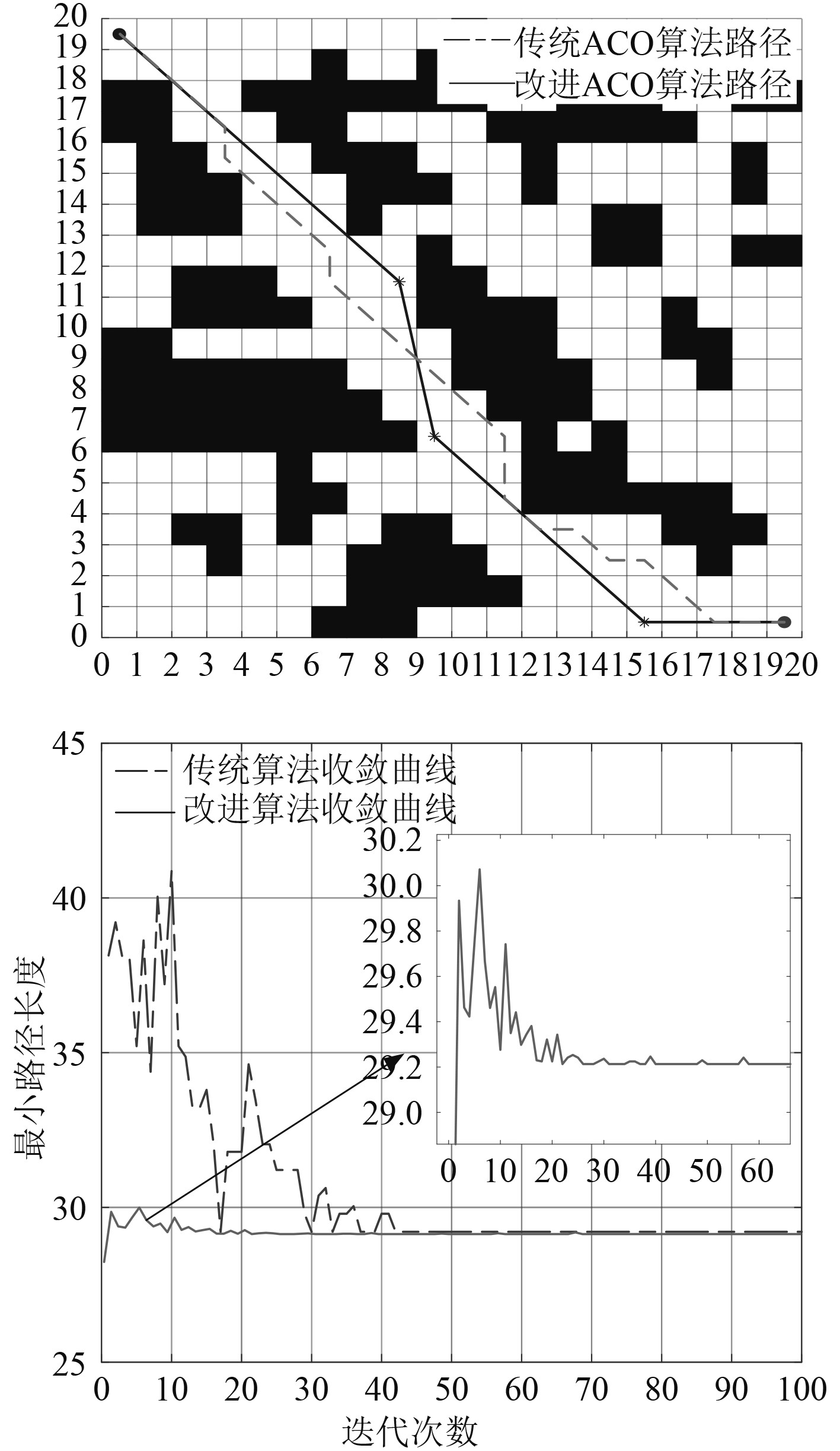 为验证改进蚁群算法相较于传统蚁群算法在寻找全局最优路径时的优越性,设计传统蚁群算法与本文蚁群算法仿真对比实验。设置规模为20×20的静态栅格地图,其障碍物覆盖率为38.25%。2种算法中的蚂蚁数量均设置50、最大迭代次数均设置100、信息素启发因子α为1、期望启发因子β为7、信息素挥发因子ρ为0.3、信息素强度系数Q为1,其中本文蚁群算法的初始信息素浓度的强化因子ξ设为10。仿真结果如图7所示。
