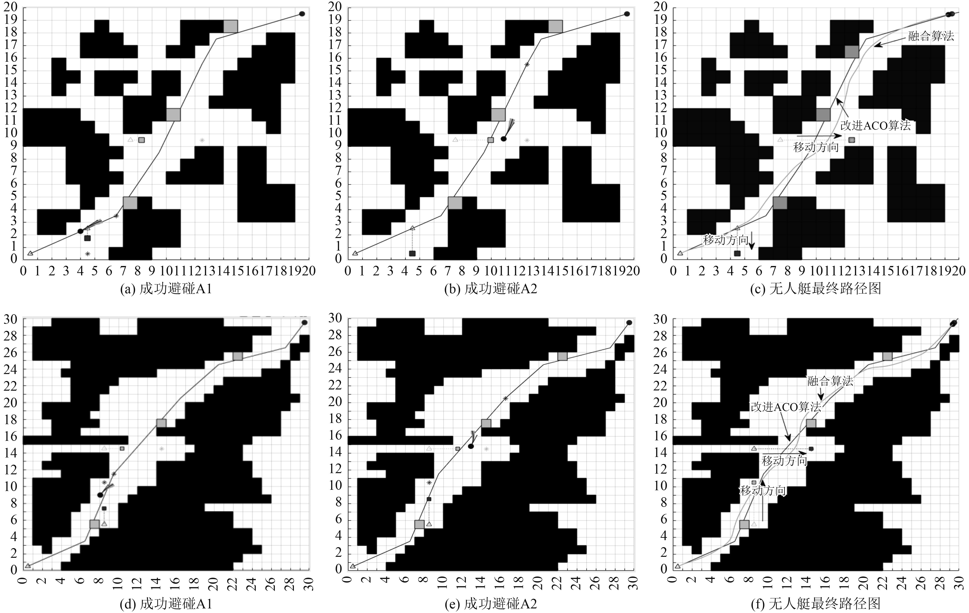 为了验证融合算法的有效性,设置为20×20和30×30的2组仿真环境,模拟无人艇航行时所处的复杂环境、图中三角形为起点、圆形为终点、灰色方块为未知静态障碍物;直线为改进蚁群算法路径、曲线为改进蚁群融合动态窗口算法路径。